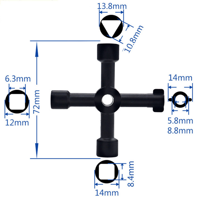 4.4 way Plumbing and Utility Key Includes: 15/64 inch female square key, 5/16 inch female square key, 3/8 inch (side dimension) female triangle key, and a double sided skeleton key
