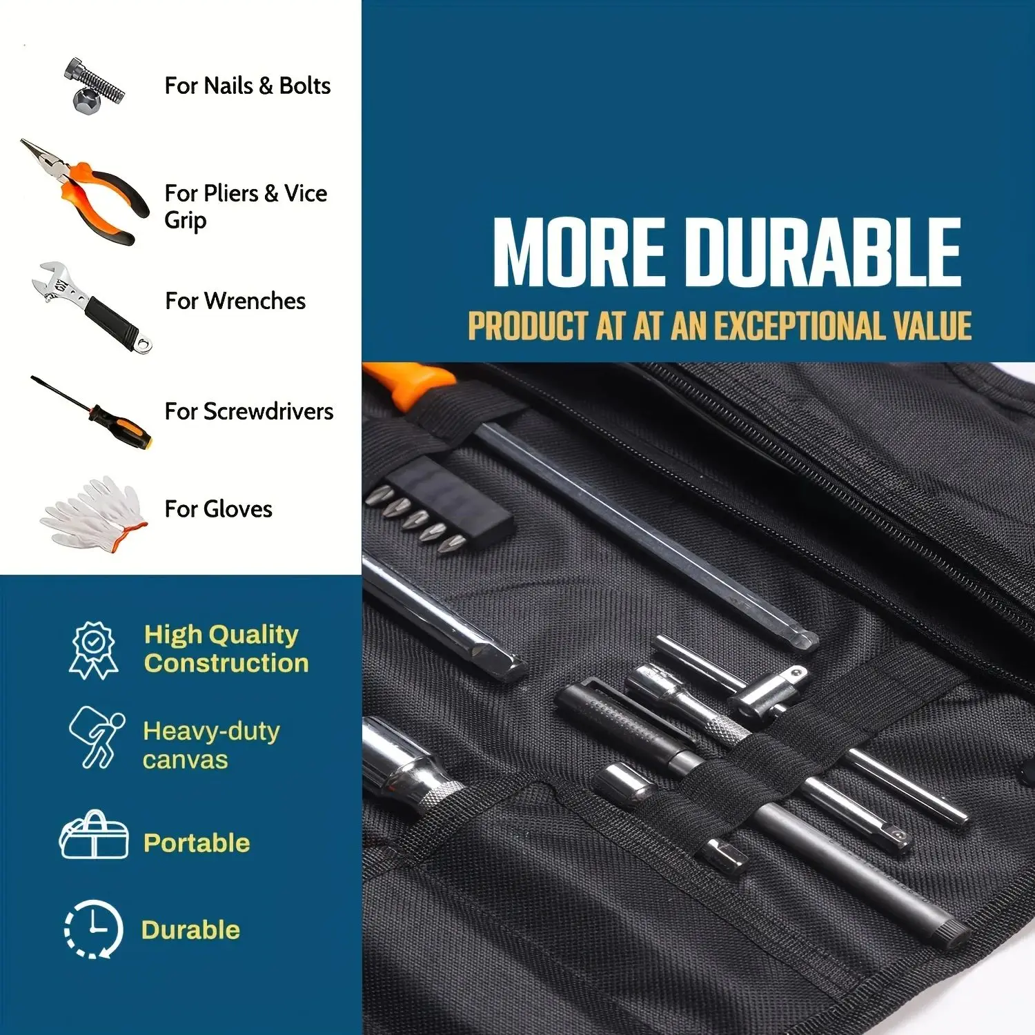 Heavy Duty Material: Our tool bag made of waterproof 600D Canvas material, which is durable and wear-resistant, ideal for carrying hand tools and other small to medium-sized items.