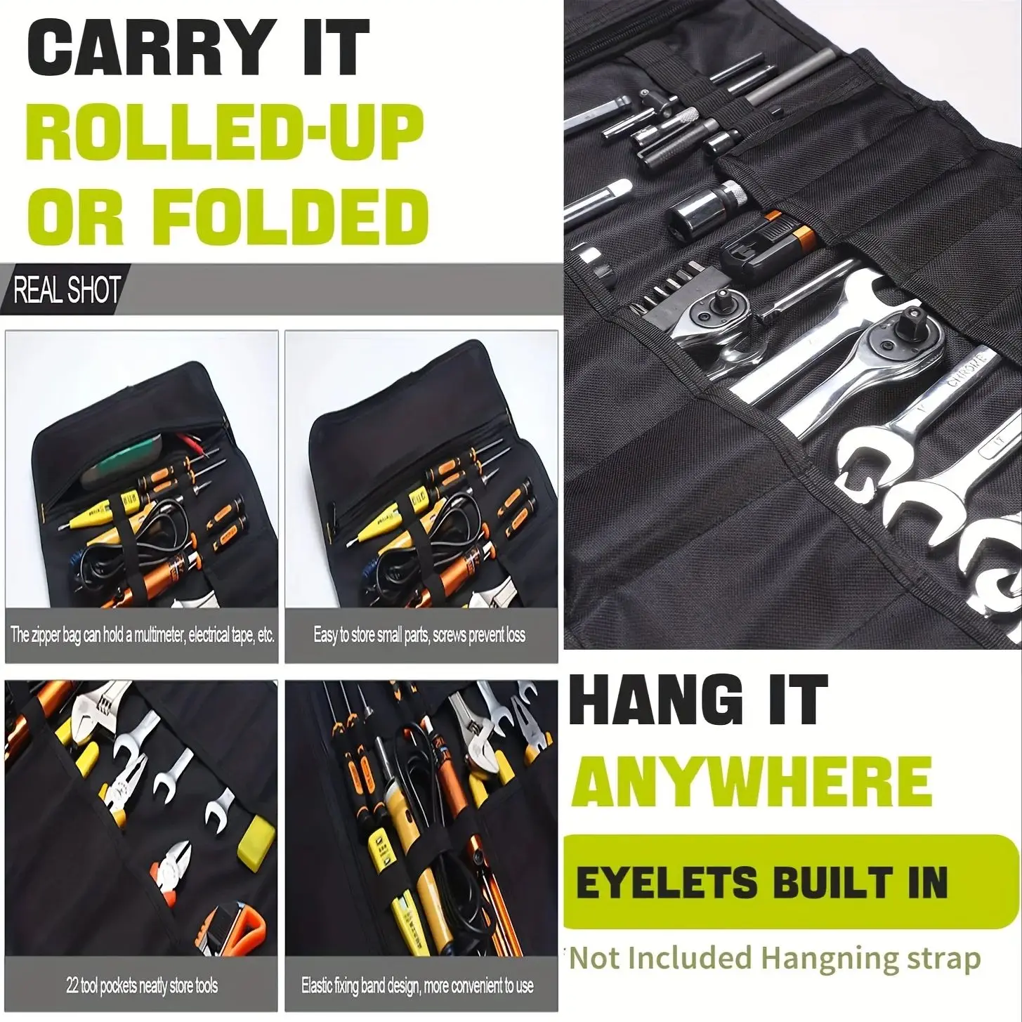 Large Capacity: The wrench roll has 22 pockets to organize smaller tools or accessories. Organize a variety of tools, screwdrivers, sockets, tire flat tools wrenches, pliers, wrenches and etc