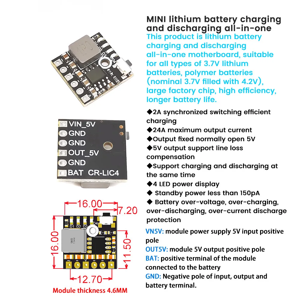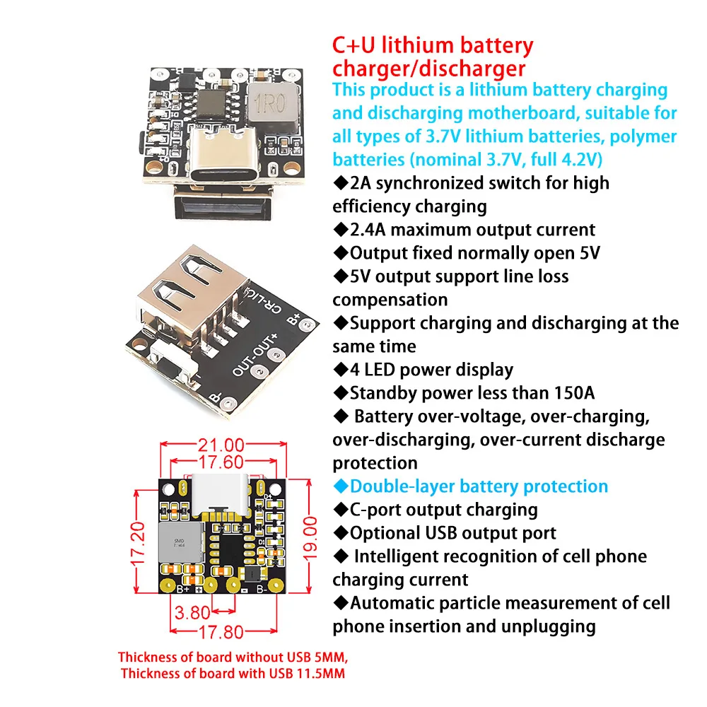 3. This product is a lithium battery charging and discharging motherboard, suitable for all types of 3.7V lithium batteries, polymer batteries (said 3.7V full 4.2V)