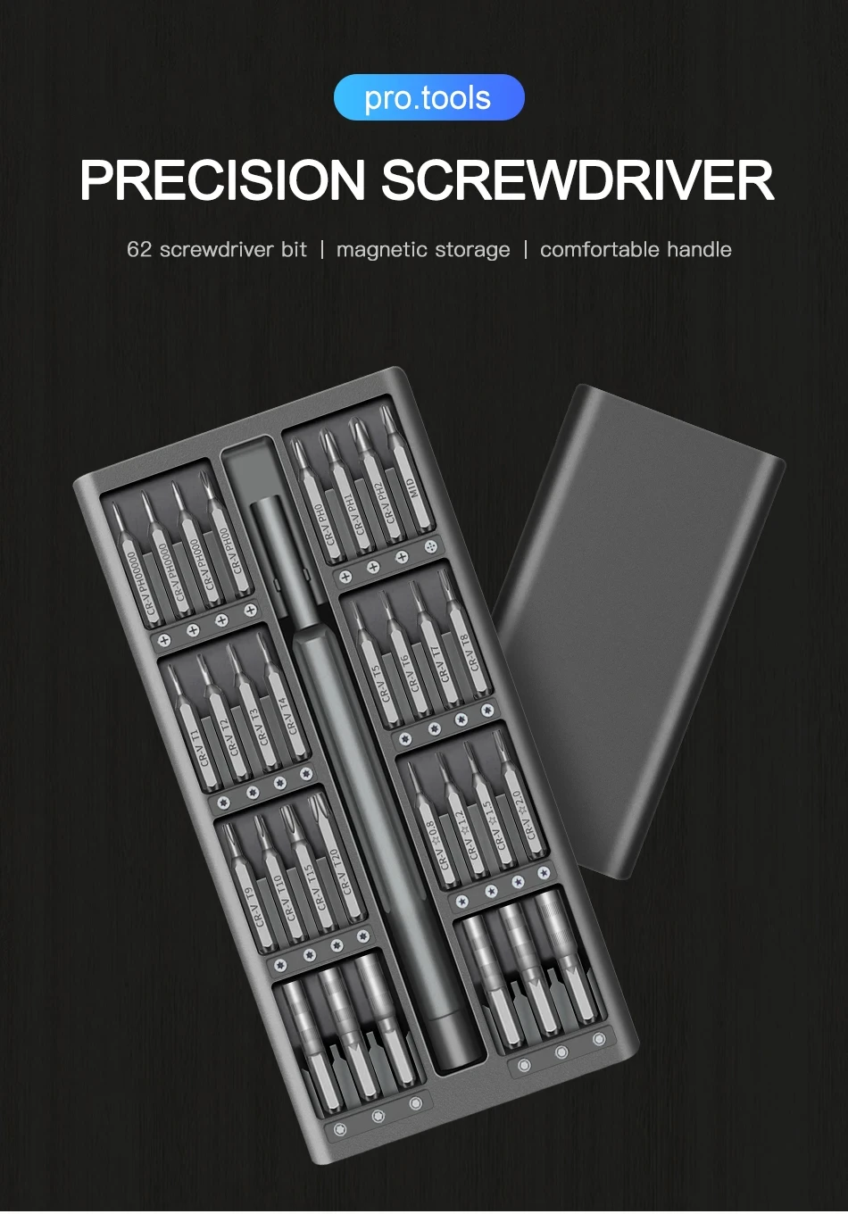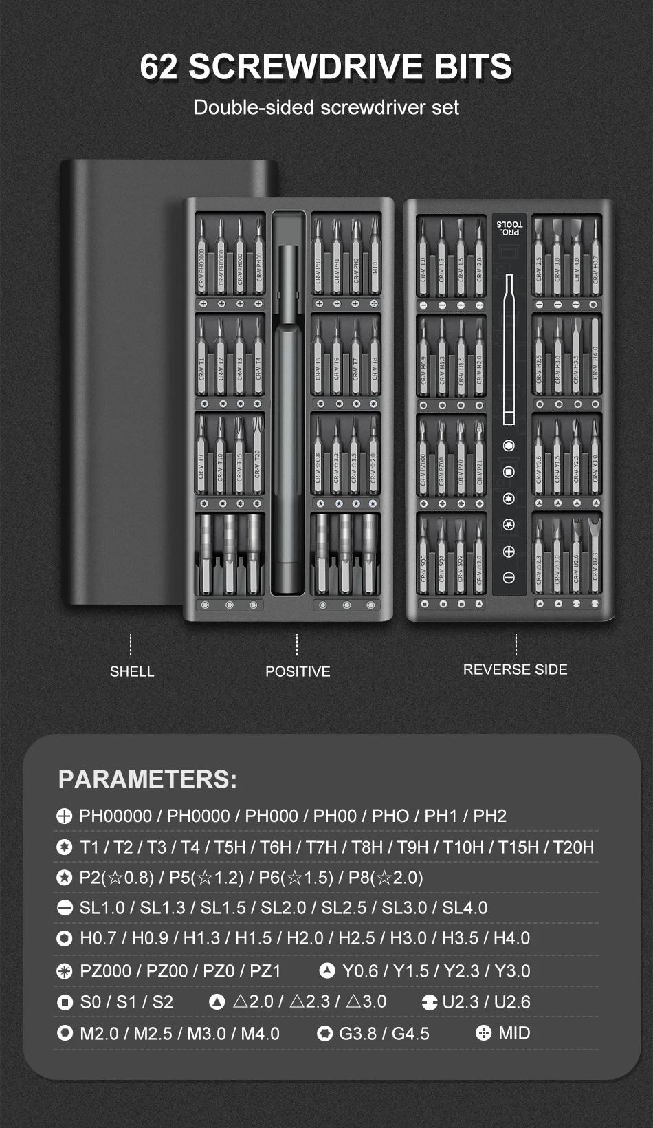 【Precision Screwdriver Set】Multi-magnetic driver Specially used for electronic equipment products.This screwdriver set includ of 62pcs screw bits(phillips, pentalobe, torx,hex, slotted, triangle, square and other sizes).It has a wide range of applications.