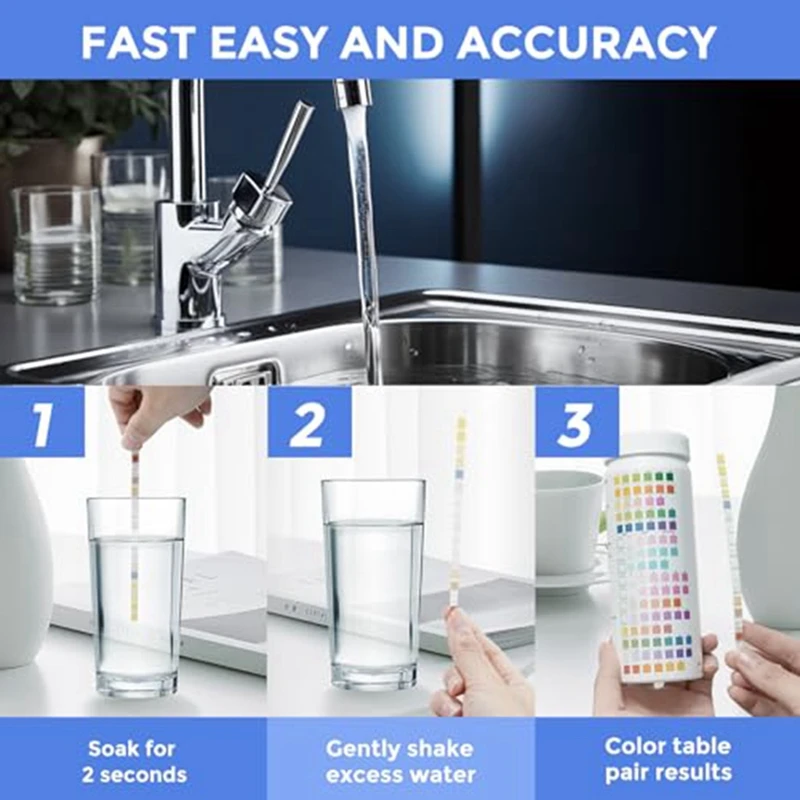 [Quick and Accurate]: The drinking water test kit provides fast, accurate and reliable results in just 3 steps. ① Dip the test paper into the water for 2 seconds. ② Take it off and hold it horizontally for 30 seconds. ③ Compare with the color chart on the bottle to get an accurate guide, clear water quality test results in 30 seconds. Conducting drinking water testing has never been easier, saving you time and money on lengthy trips to the lab.