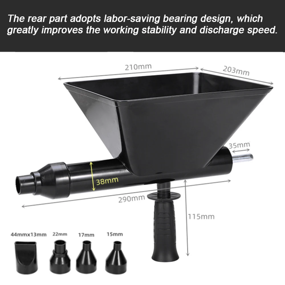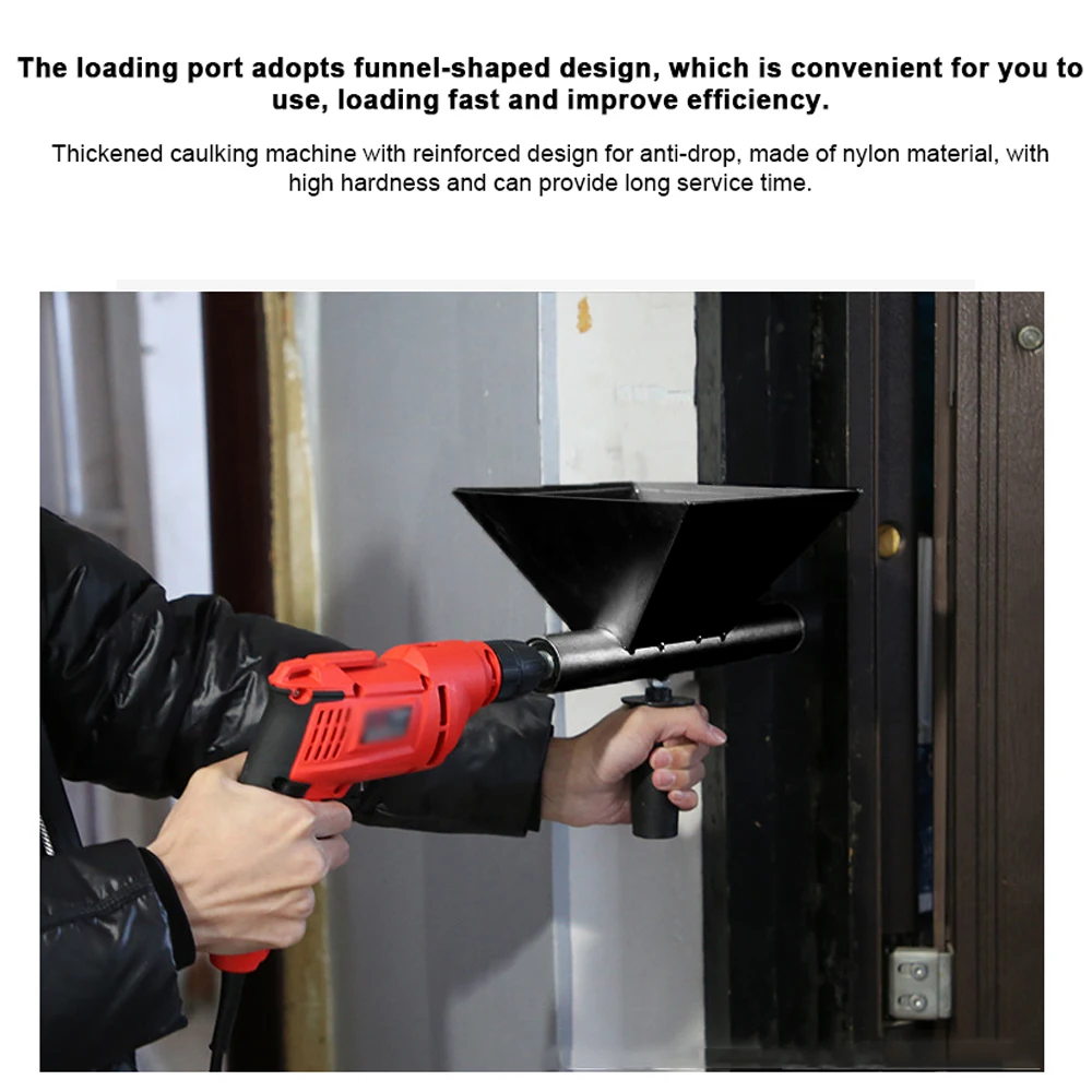 Electric caulking machine, with 8mm diameter electric drill joint for use with electric drill, convenient to use, smooth and labor-saving, improve caulking efficiency. The loading port adopts funnel-shaped design, loading fast and improve efficiency. The rear part adopts labor-saving bearing design, which greatly improves the working stability and discharge speed. Suitable for a variety of scenarios, such as caulking construction, door and window caulking, brick wall caulking, construction sites, etc.