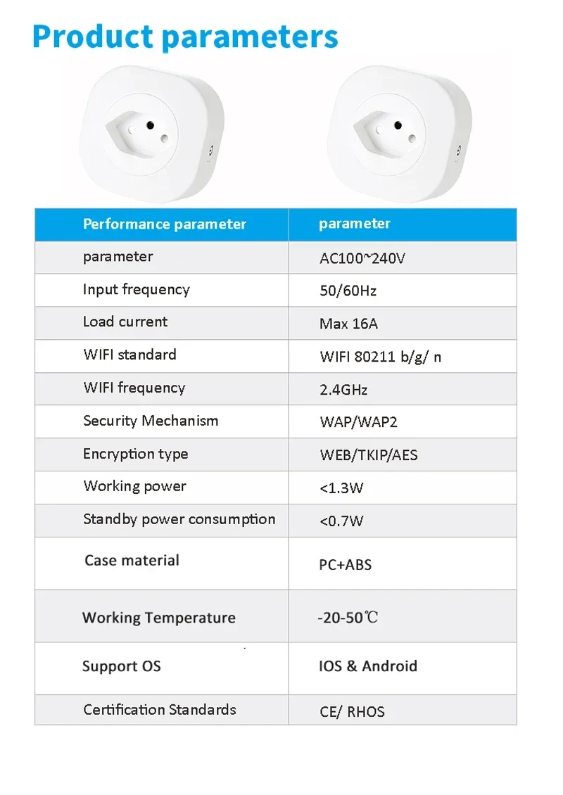 Specifications:IOS/Android APP: Smart lifeInput voltage: AC100-240V 50/60HzOutput current: 16ADouble USB Total current max: 2.1ASingle USB current max: 2.1AHousing: ABS+PC fireproof materialCertification: CE/FCC/ROHSWorking humidity: <80%Working temperature: -20 ° C~ 50 ° CColor: WhiteSupports Voice ControlPackage Contens- Smart Plug- User Manual