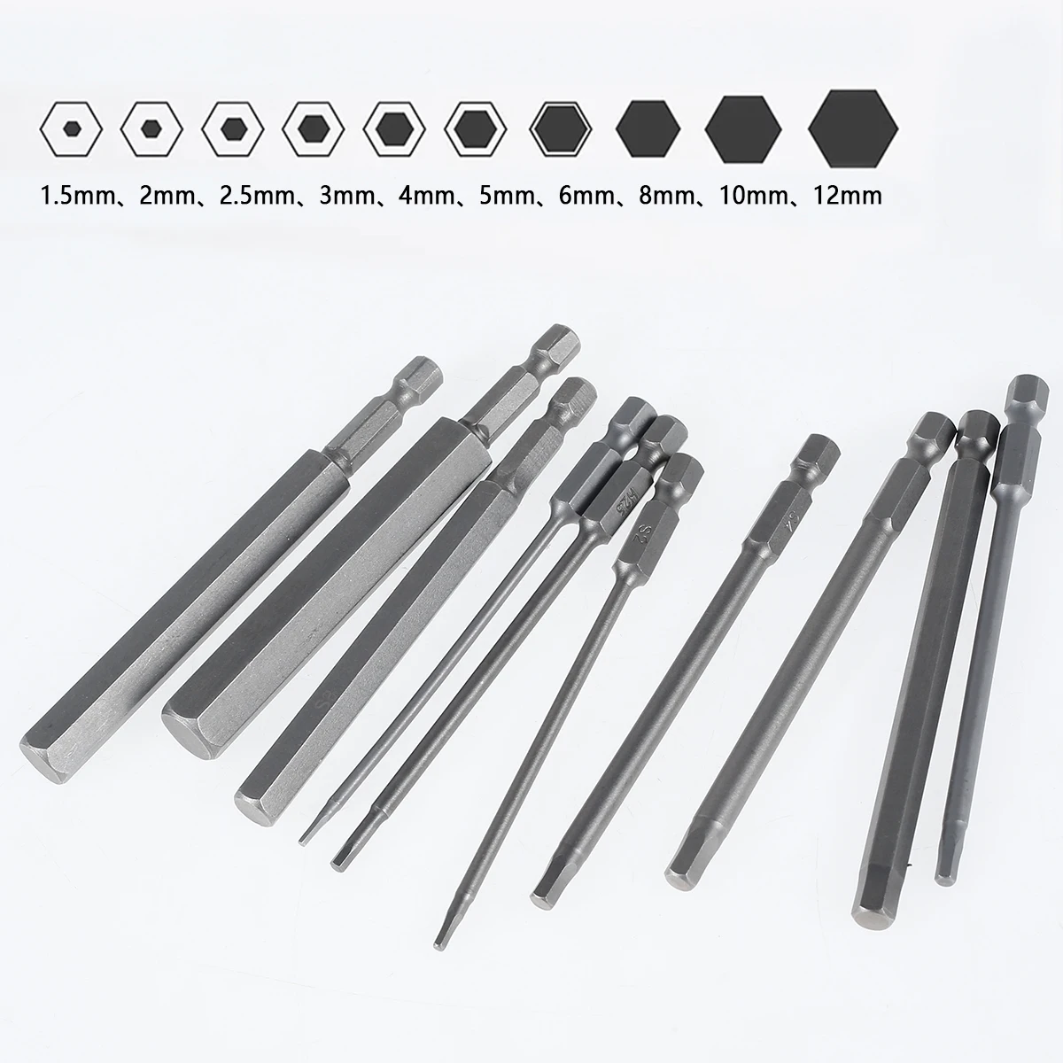 [Size & Package] The package includes 10pcs hex bits with different sizes, including 1.5/2/2.5/3/4/5/6/8/10/12mm. Multiple sizes and sufficient quantity can meet your different working needs, widely used for household tool repair.