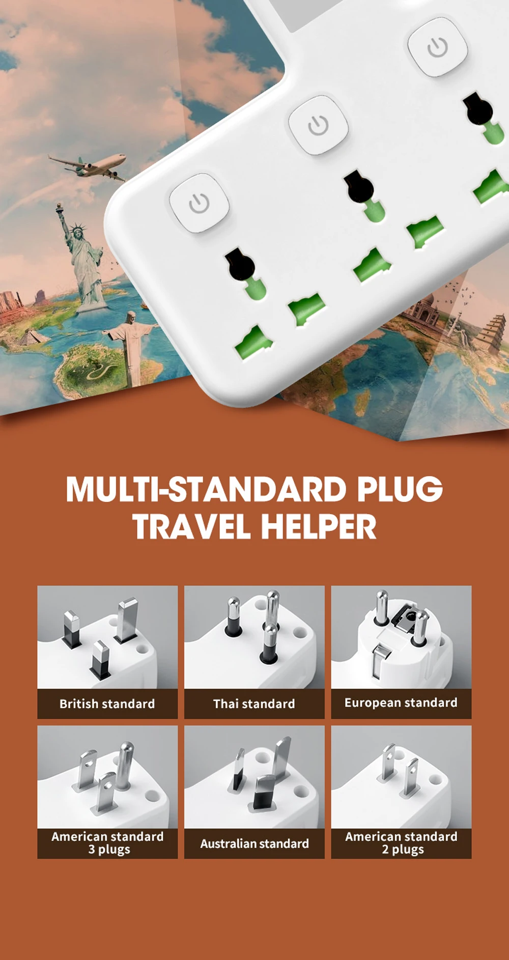 Adopt to many kinds of lo cal and overs eas standard plugs, us ed whole phos phor bronze for the inside plug bush. perfect conduction and degree or elasticity. and get through the safety test by national professional instiution.