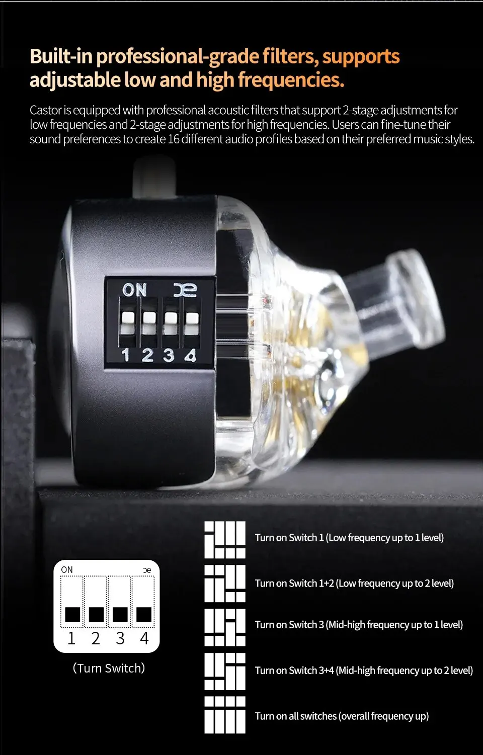 Castor is equipped with professional acoustic filters that support 2-stage adjustments for low frequencies and 2-stage adjustments for high frequencies. Users can fine-tune their sound preferences to create 16 different audio profiles based on their preferred music styles