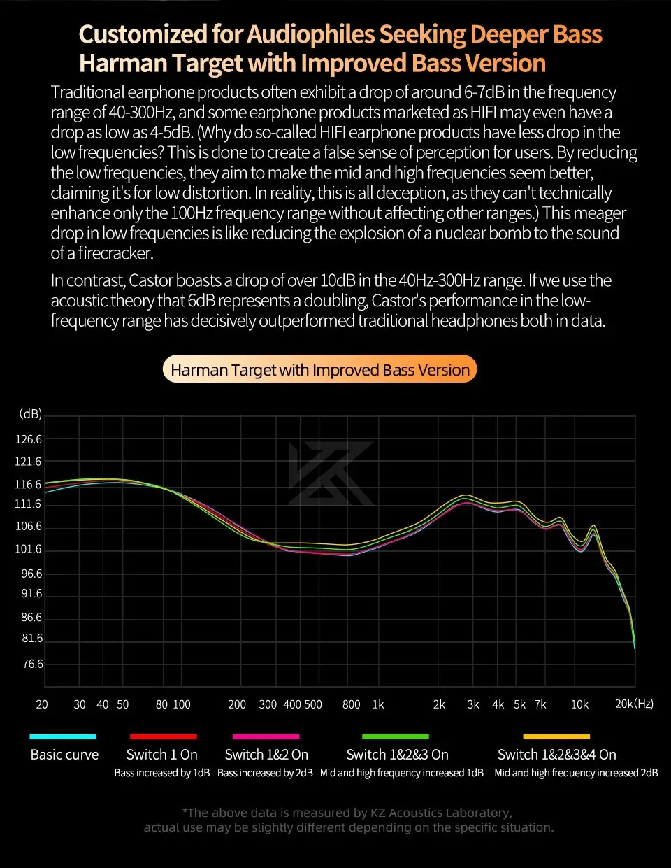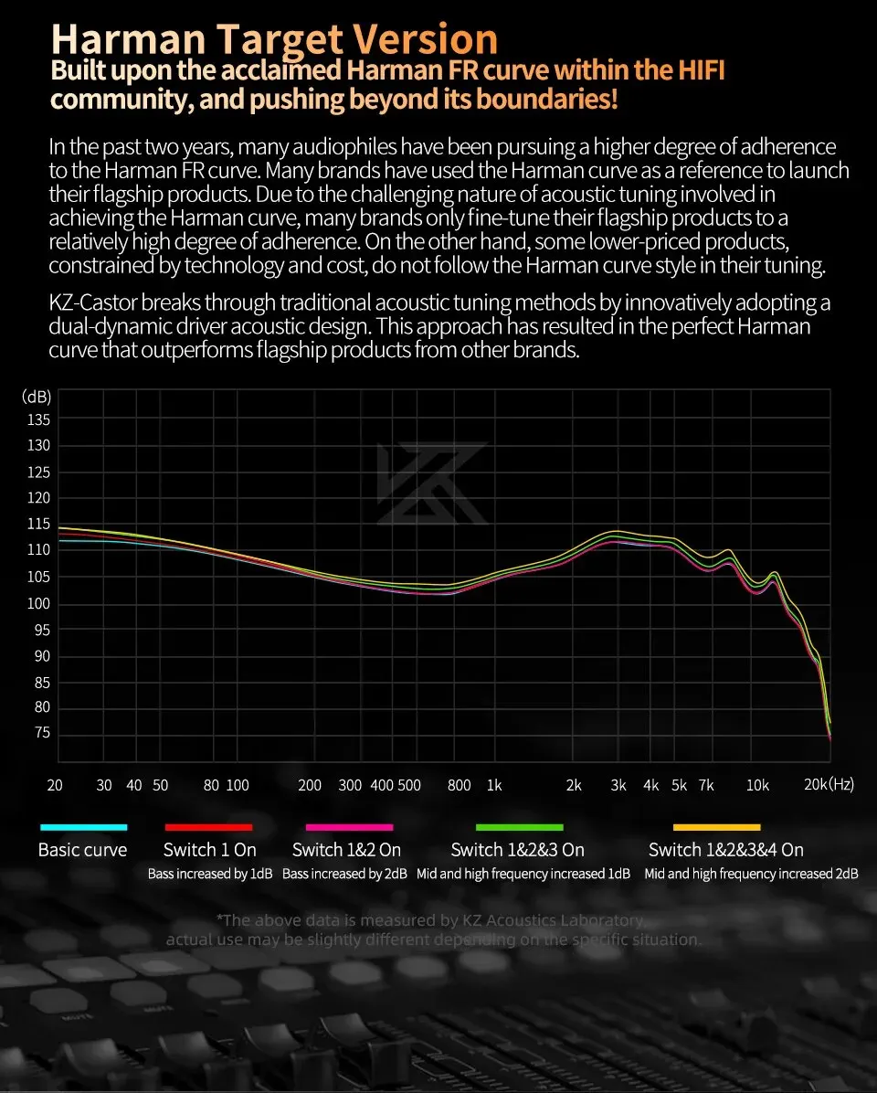 KZ-Castor breaks through traditional acoustic tuning methods by innovatively adopting a dual-dynamic driver acoustic design. This approach has resulted in the perfect Harman curve that outperforms flagship products from other brands.