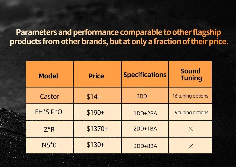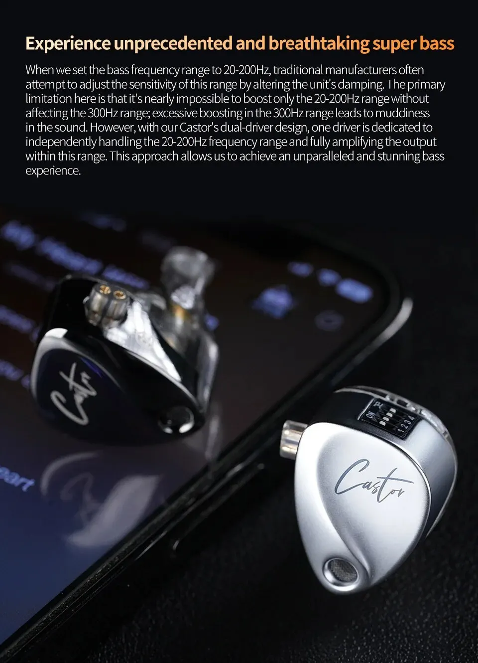 Castor features a unique design with two stacked dynamic drivers. One driveris dedicated to producing frequencies around 20-200Hz for bass output, while the other diverhandles mid and high frequencies. Through precise electronic crossover technology, these two divers work synergistically without interference between their frequencies. This enables Castor to deliver powerful and energetic bass as well as stunning mid and high frequencies.