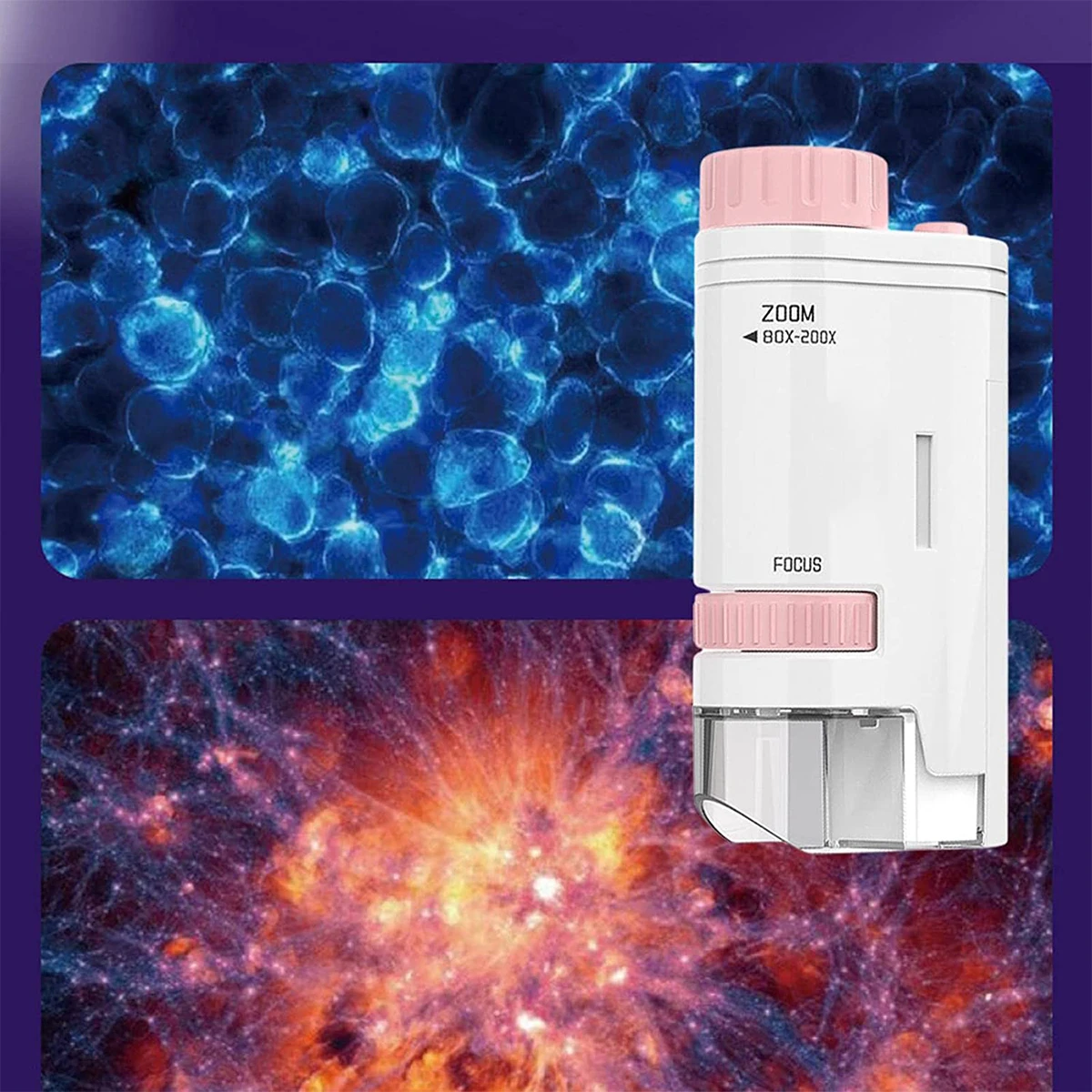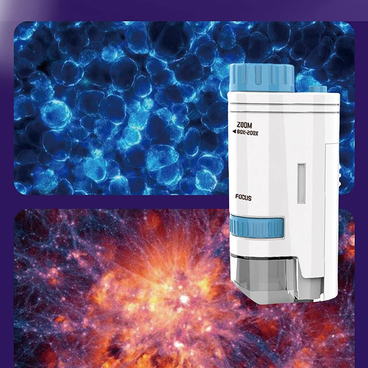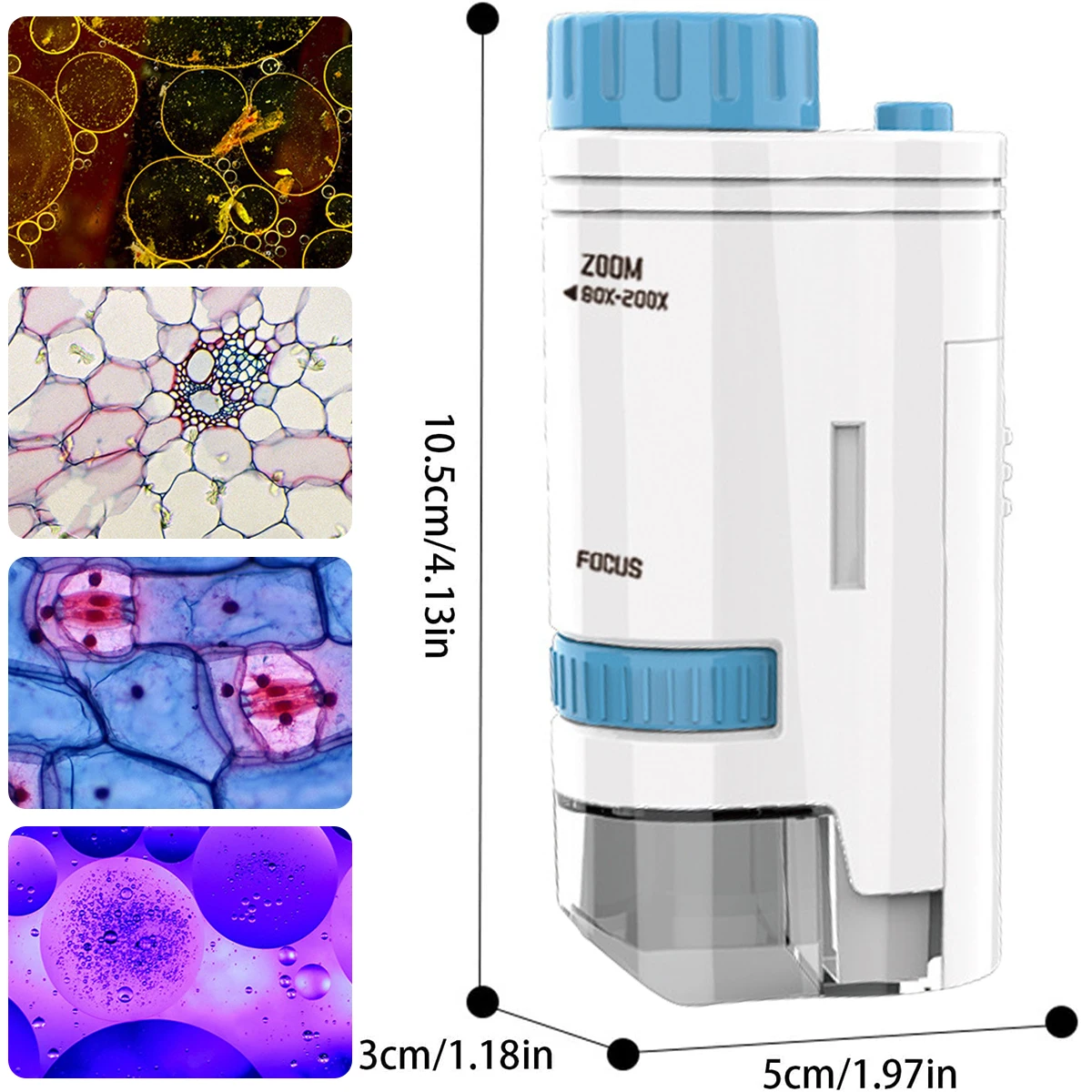 [60-200X] This pocket microscope can magnify 60 to 200 times so that can clearly see individual cells, which can quickly focus and adjust the magnification through the knob. The high-definition eyepiece allows you to open the mysterious world.