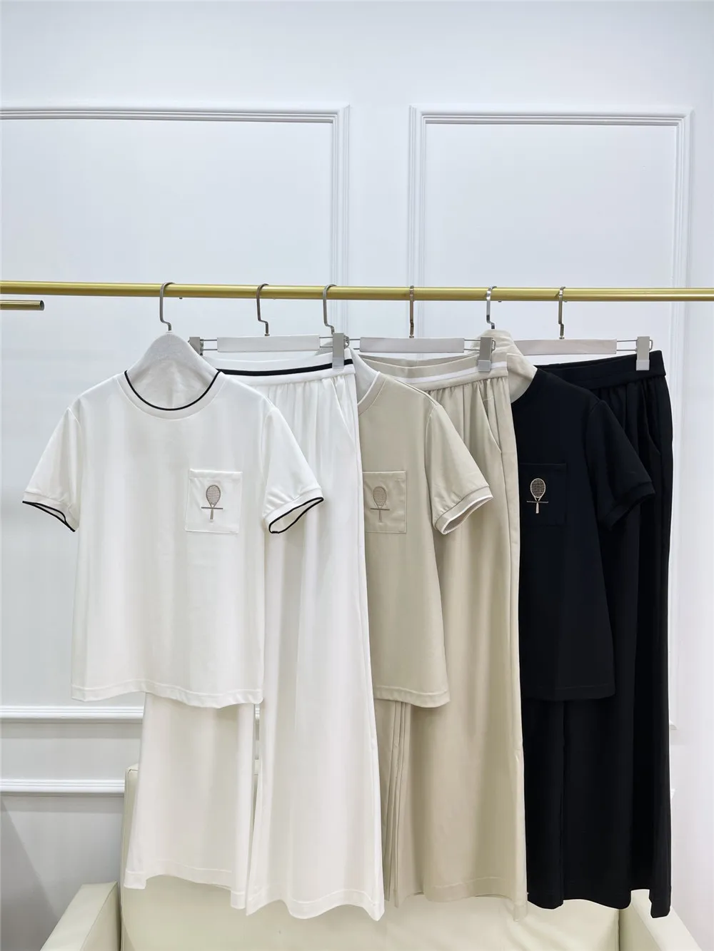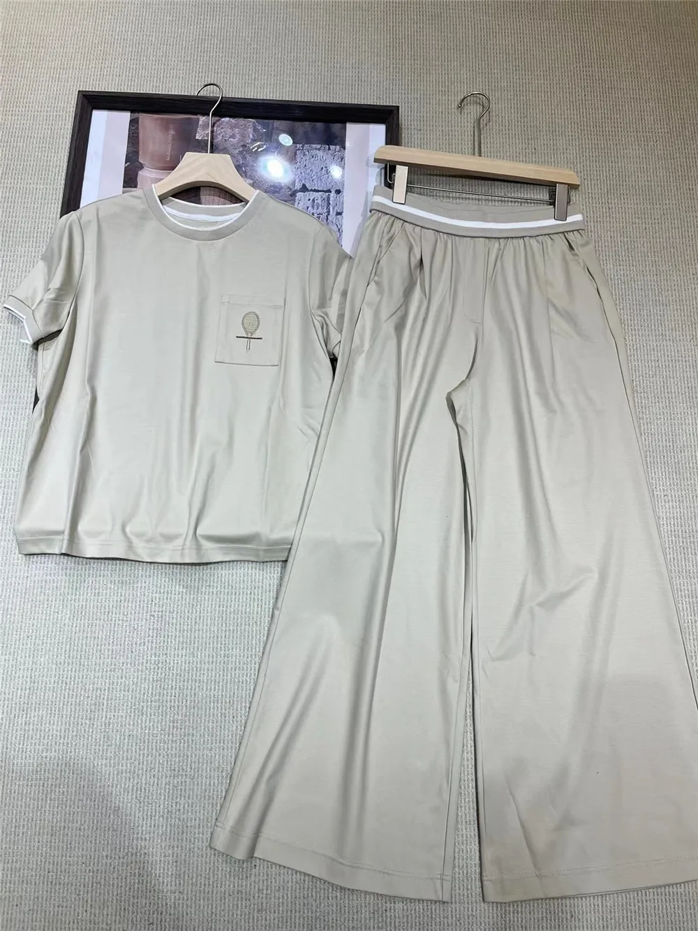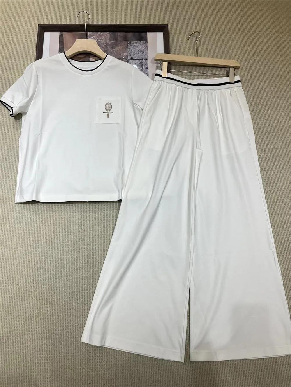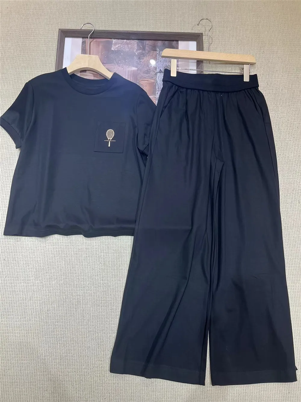 Casual Sports Suit For Women Chain Pocket Embroidered T- Shirt + Elastic Waist Wide Leg Pants 2 Piece Set