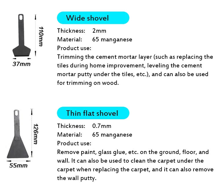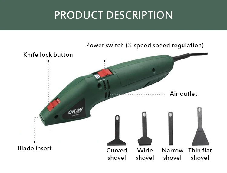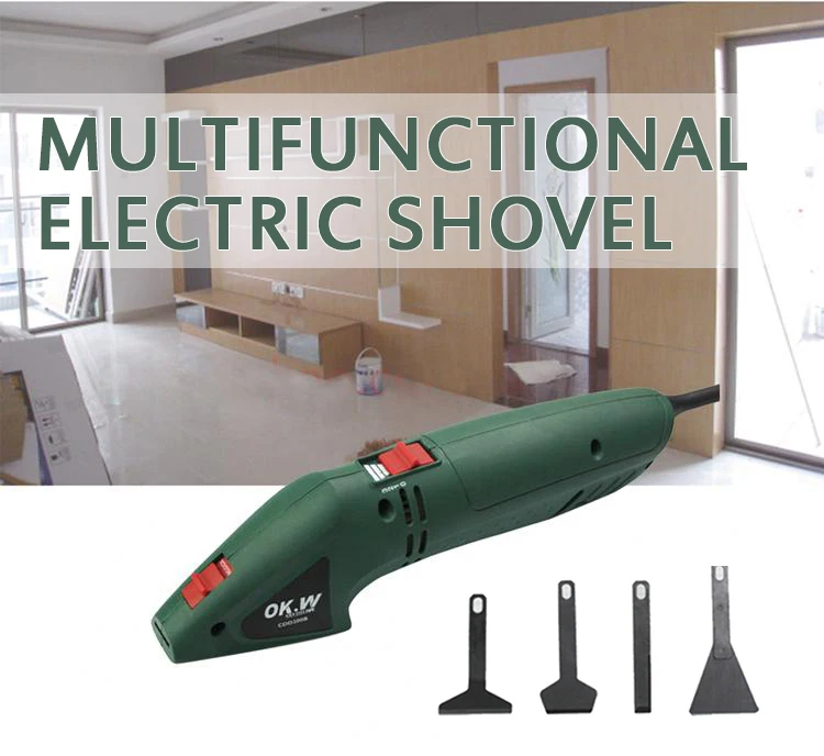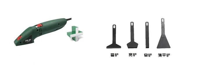 The working principle of the electric shovel: realize the shoveling function with high-frequency reciprocating motion. , General wood carving, grooving, angle cleaning, plane trimming and grinding, grinding of metal and other surface roughness, and removal of paint and other work.