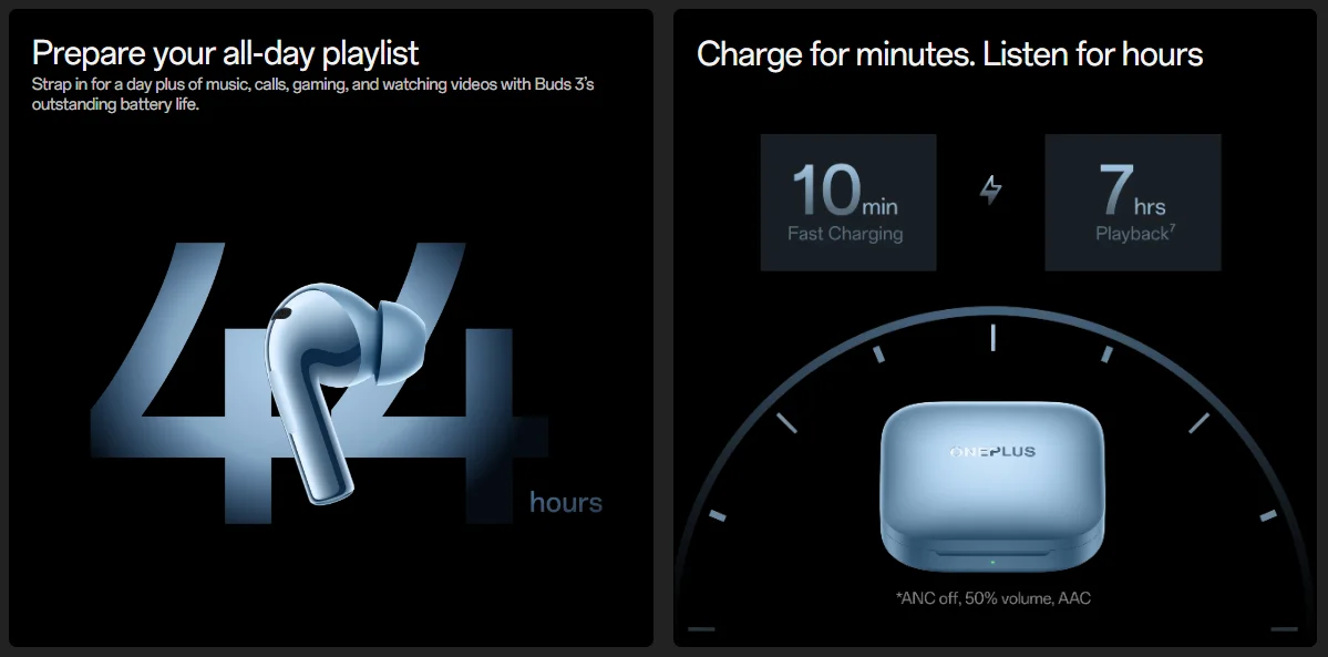 3. OnePlus Buds 3 can achieve up to 44 hours of battery life when used with the charging case. Fully charged earbuds deliver up to 10 hours of playtime with the volume at 50%, in AAC mode with ANC off. Up to 28 hours of battery life when used with charging case in AAC mode with ANC on, and volume set at 50%. Full charged earbuds deliver up to 6.5 hours of playtime with these settings. Playtime may vary depending on, among other factors, volume and frequency settings, incoming calls, output source, environmental interference, and product features activated.