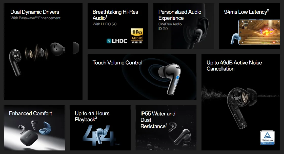 Product specifications and claims are subject to change without notice, which may include (but is not limited to) variances caused by different software versions. For up to date product information, please visit oneplus.com/oneplus-buds-3.