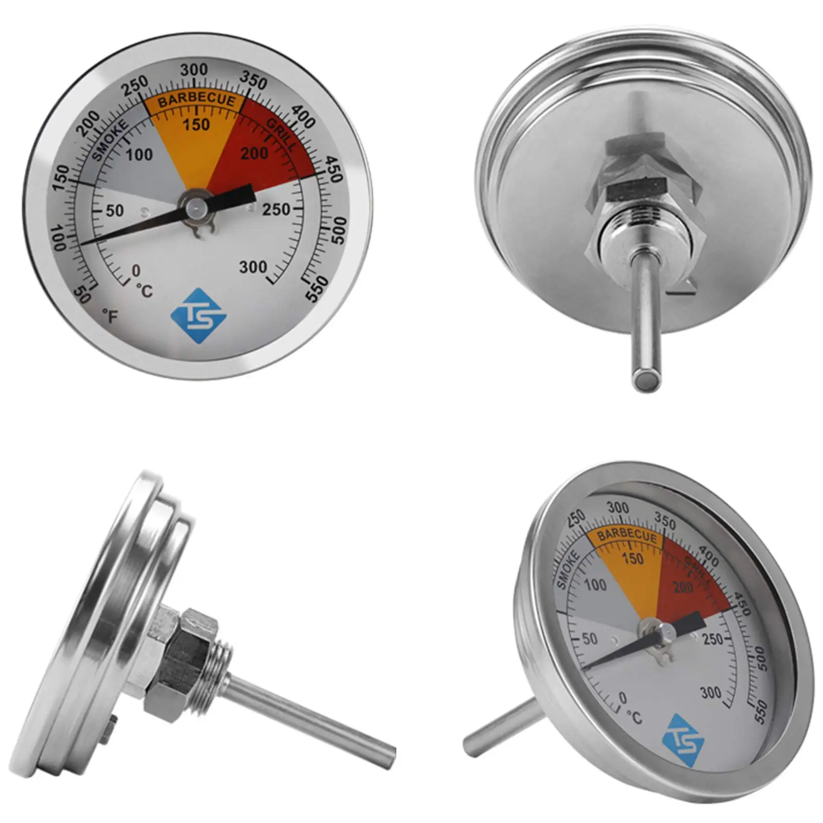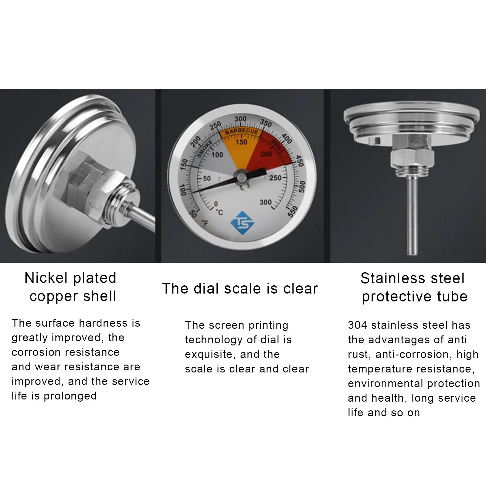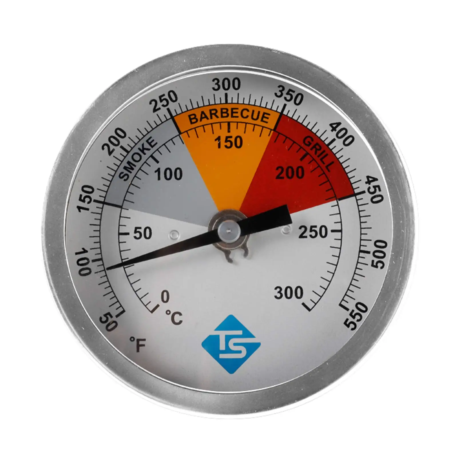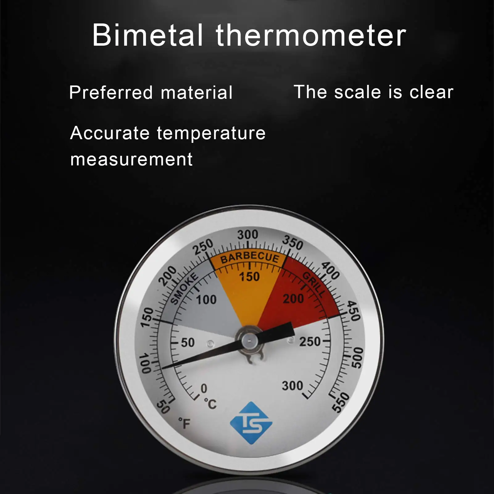 Flaming Coals ReCalibratable BBQ Smoker Thermometer GaugeProduct Description:Complete with colour-coded temperature zones so you can easily see if you are in the correct temperature range and a re-calibration adjustment screw.The display is in both degrees Celsius and Fahrenheit. 8cm diameter face.Measuring range: 0~300℃, 0~550°F.Bimetal thermometers have the advantages of no mercury damage, easy reading, firmness and vibration resistance, etc.They can replace industrial glass mercury thermometers and are widely used in industrial and scientific research departments.Specifications:Condition: 100% Brand NewMain Material: MetalProduct Size: 8.2*8.2*8.7cmWeight:161gThread mounting size: 1/2 inch NPTPackage Contains:1 x Thermometer Gauge