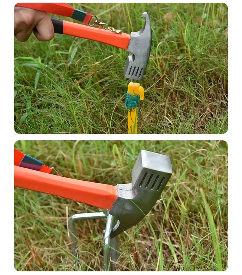 * Hammer head is with goat hair corn shape hook, can be used as the digging tool and extractor, removing the nails and stakes,solid head can be used as the nail hammer for driving tent.