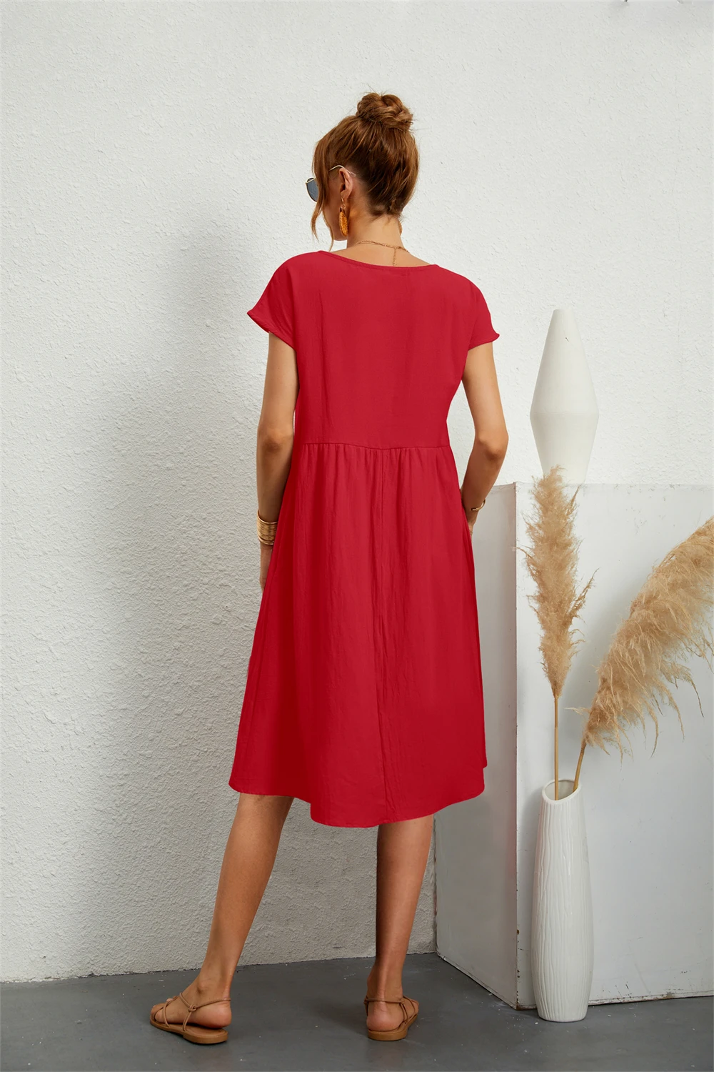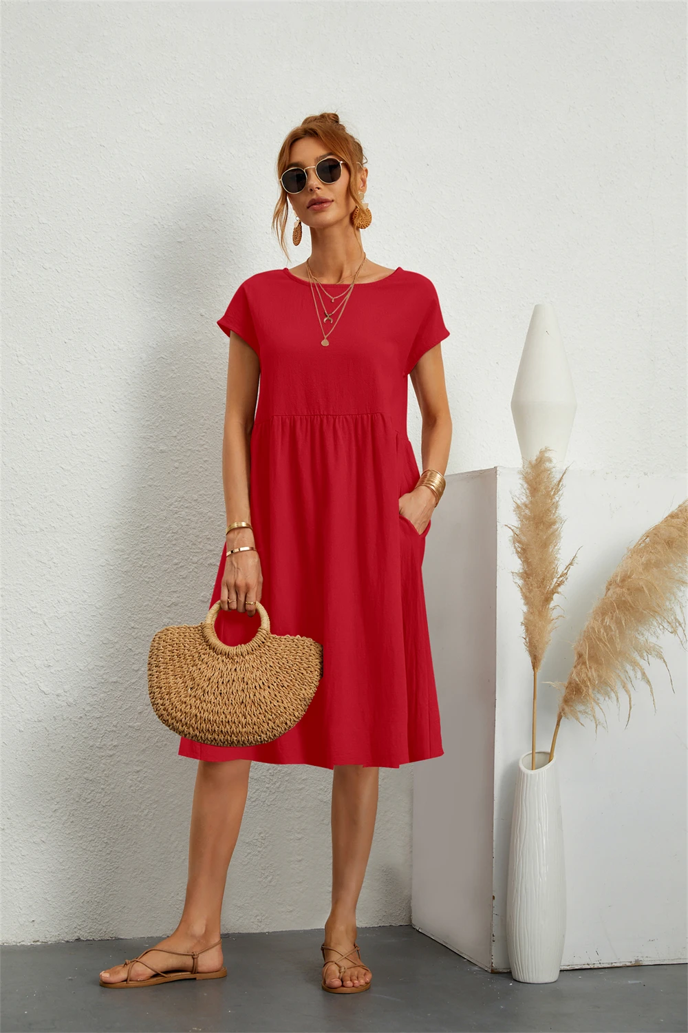 Women Casual Dresses Summer Vintage Style Female O-neck Solid Color Comfortable Knee-Length with Pockets