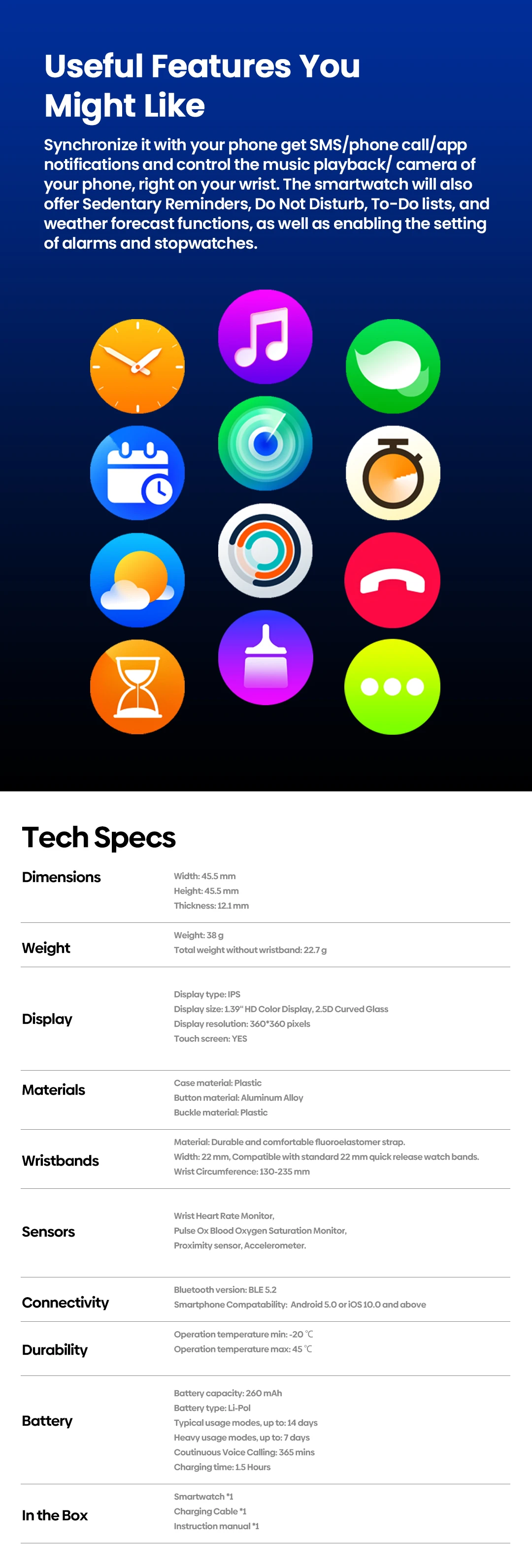 【Your Smart Partner】Synchronize it with your phone get SMS/phone call/app notifications and control the music playback/ camera of your phone, right on your wrist. The smart watch will also offer Sedentary Reminders, Do Not Disturb, To-Do lists, and weather forecast functions, as well as enable the setting of alarms and stopwatches.