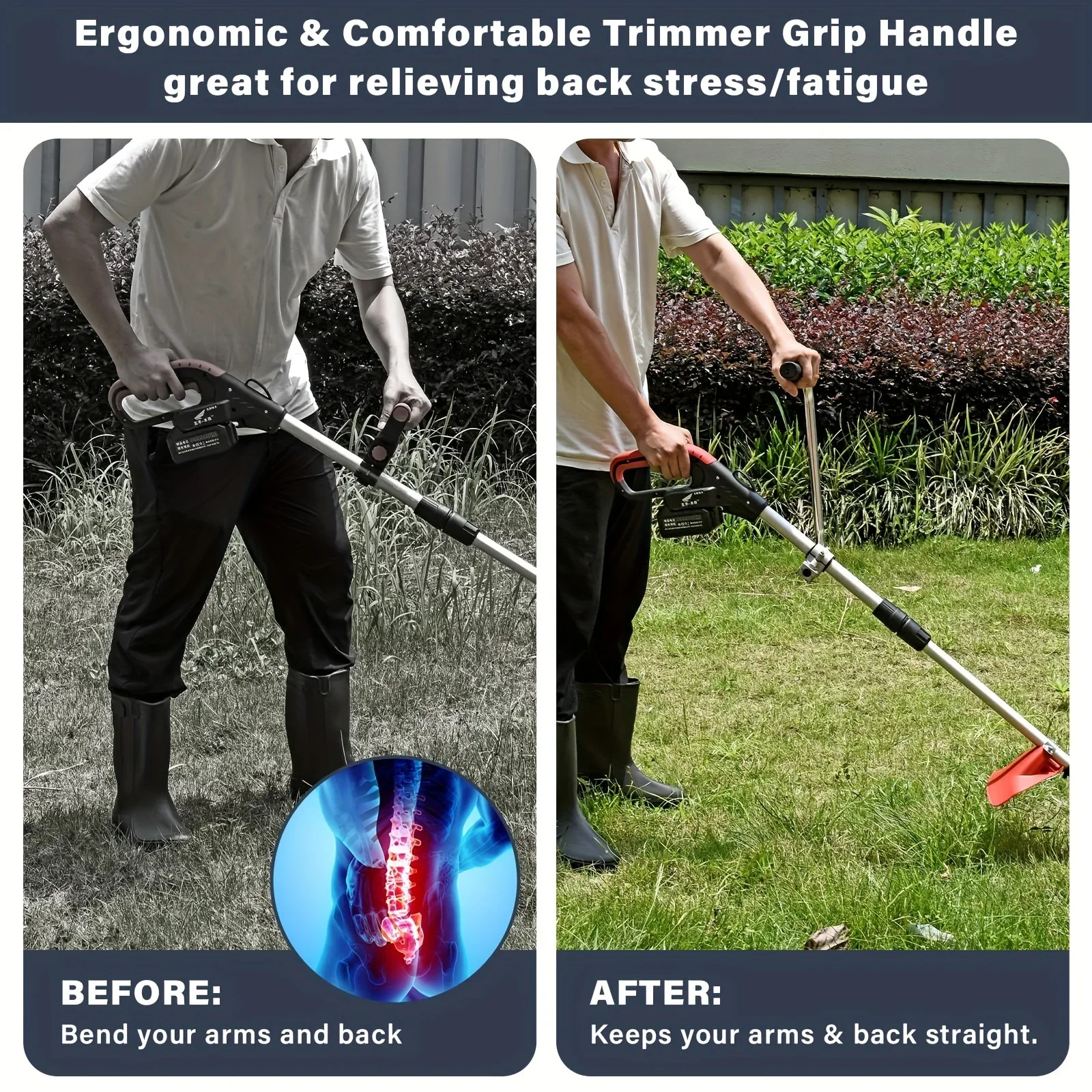【Increase Comfort & Reduce Pain】trimmer grip handle is an attachment that can be installed onto the main shaft of a weed trimmer or edger. It allows the operator to grip the weed trimmer or edger ergonomically, maintaining a more upright position and reducing back strain and injury. This increases comfort and reduces pain during use.