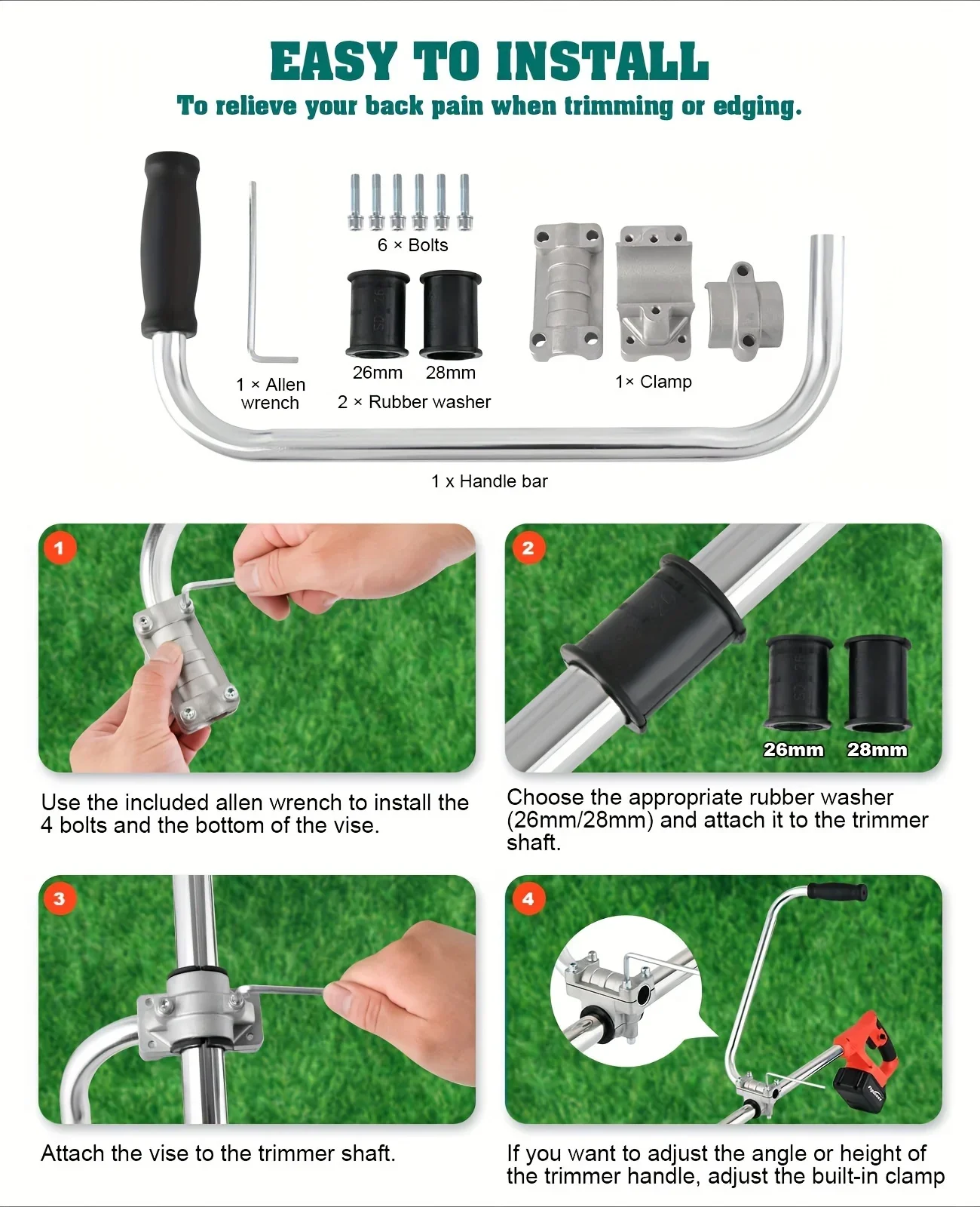 【Durable & Ergonomic Grip Handle】 weedeater grip handle is super durable and sturdy enough for extended use. The ergonomic trimmer grip adds only a negligible amount of weight to the trimmer shaft, making it easy to edge, trim, and maintain your yard, lawn, or landscaping. If your arms or back are bent after installing this trimmer handle, simply slide the vise up or down to find a comfortable position.
