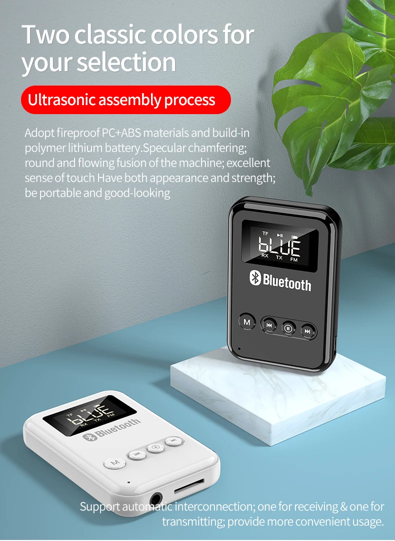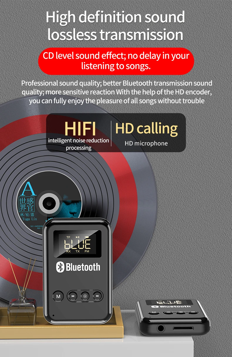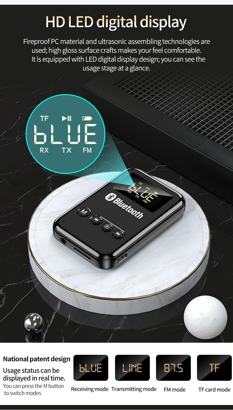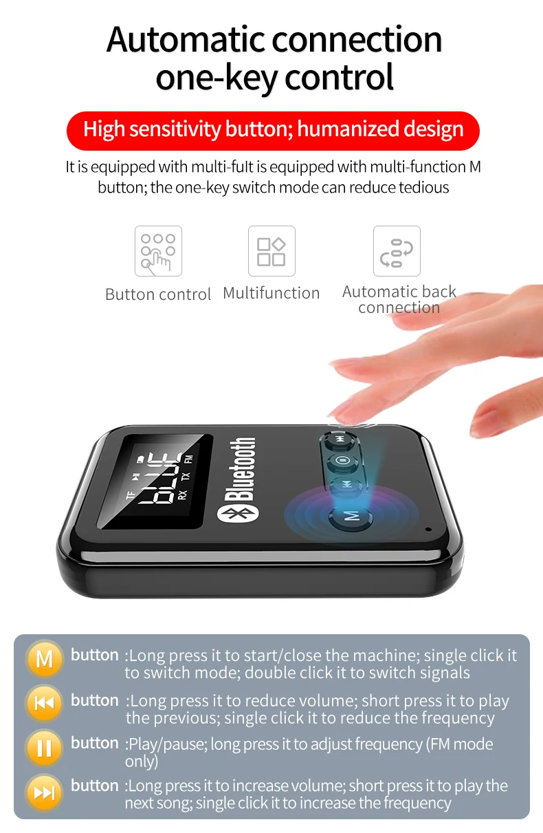 Experience seamless connectivity with the versatile Bluetooth Receiver Transmitter 5.0 Wireless Adapter. Its multifunctional design allows you to easily convert wired audio into Bluetooth signals and transmit them to your preferred device. With a sleek LCD display showing searched Bluetooth devices, you can conveniently switch between transmitter and receiver modes. Plus, the Bluetooth 5.0 technology guarantees wider transmission distance, faster data rate, and minimal power consumption. Ideal for home sound systems or vehicles, this adapter ensures a reliable hands-free call experience. Get yours today and enjoy the benefits of enhanced connectivity.