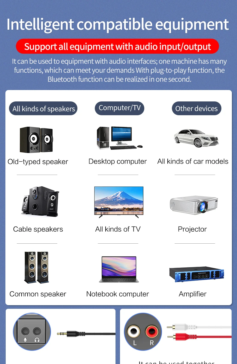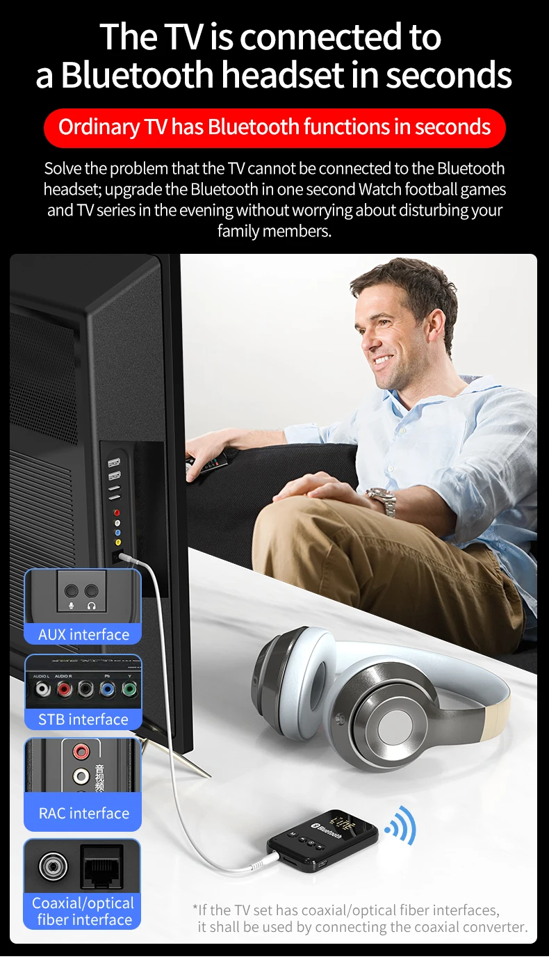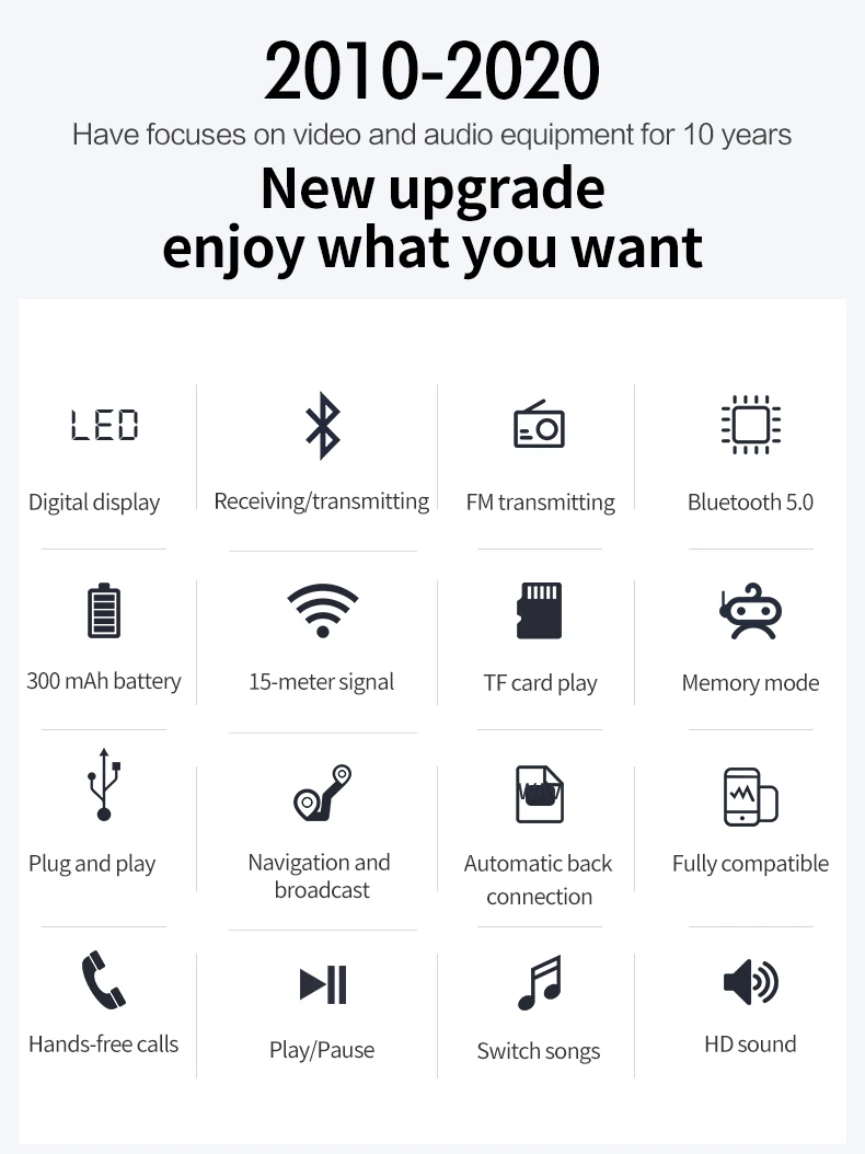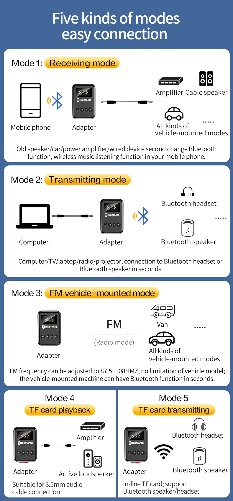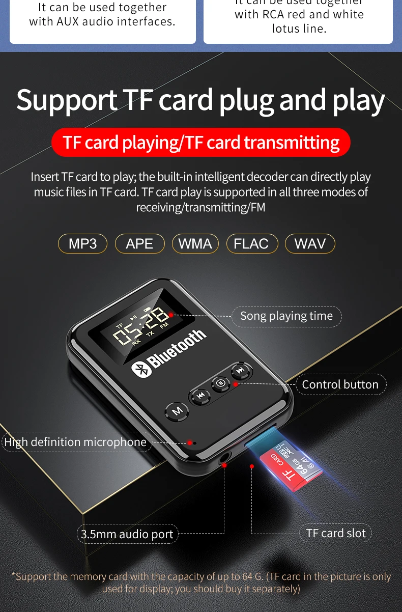 ★Transmitter Receiver 3-In-1: Bluetooth transmission mode (TX): Convert wired audio into Bluetooth signal, and transmit it to Bluetooth device for output. Bluetooth Receive Mode (RX): Receive Bluetooth signal and transmit it to wired audio through Bluetooth connection. FM function:for those cars which don't support 3.5mm Jack output