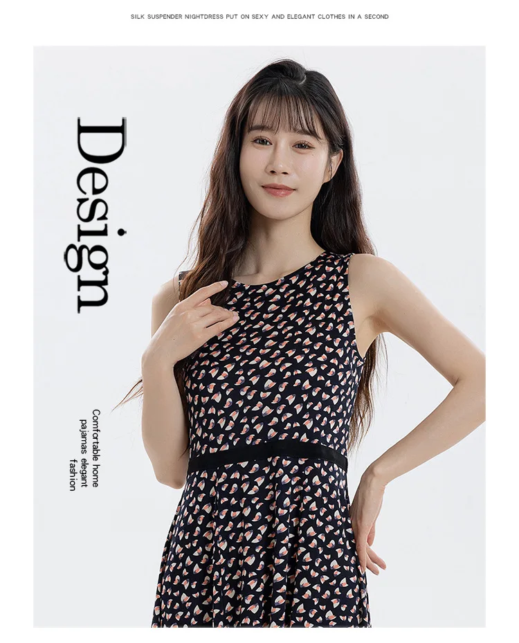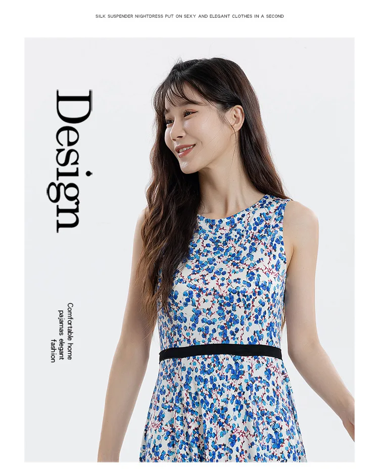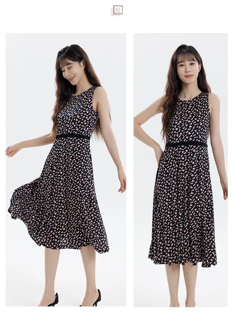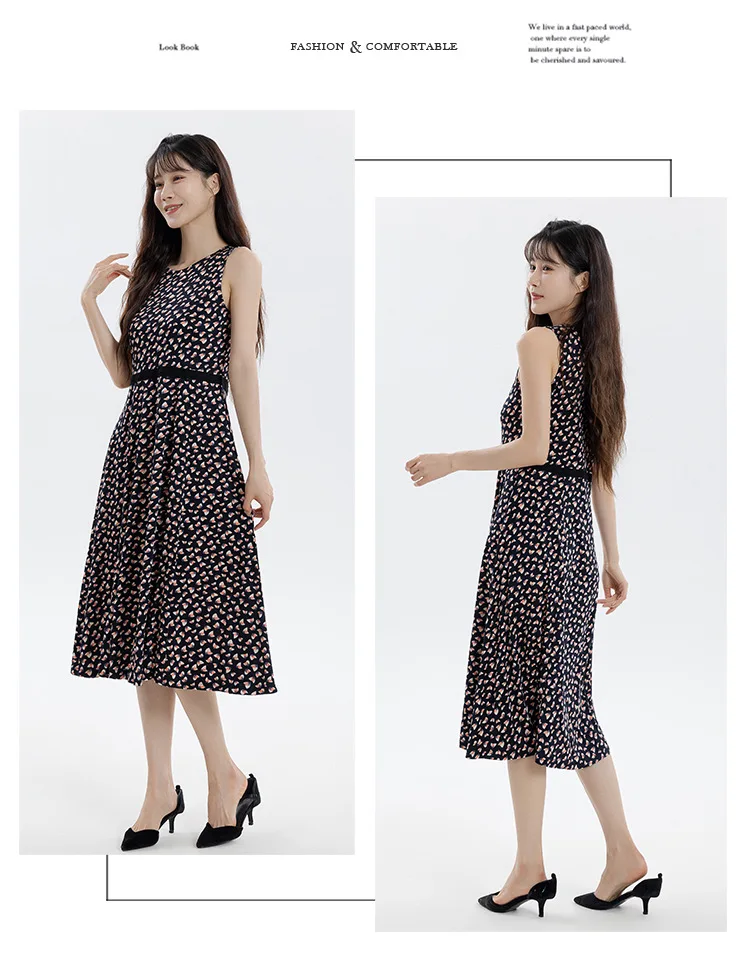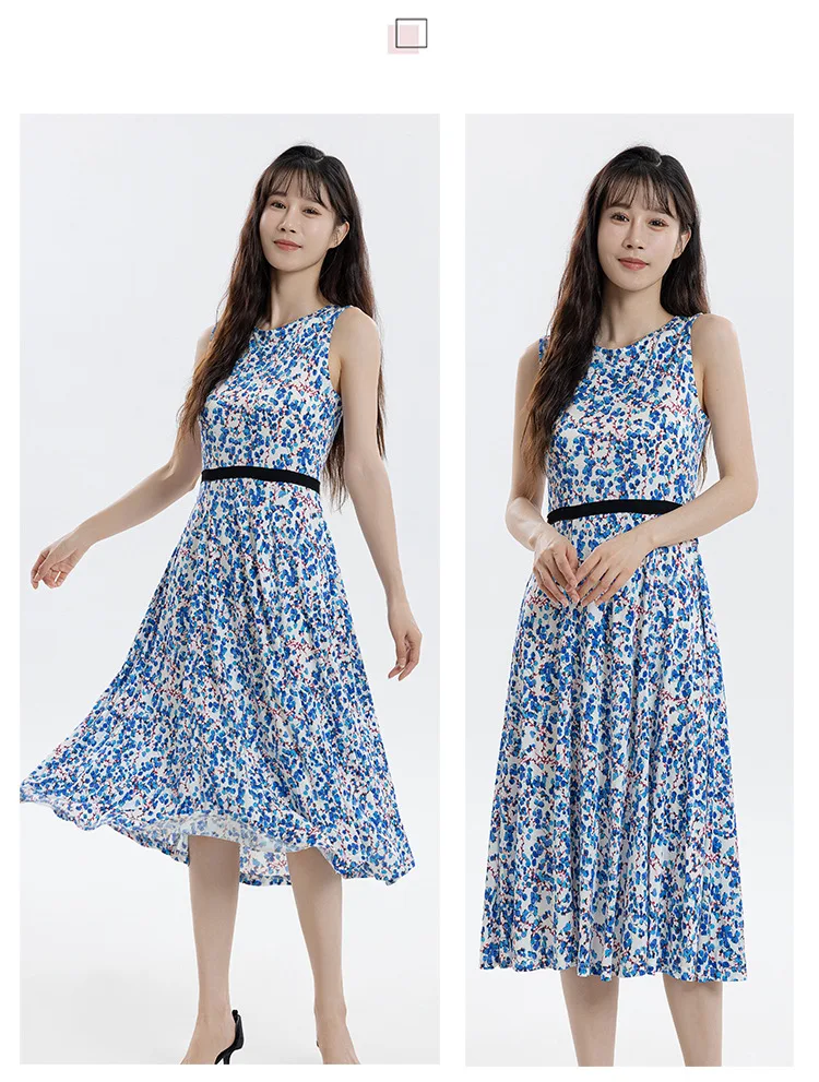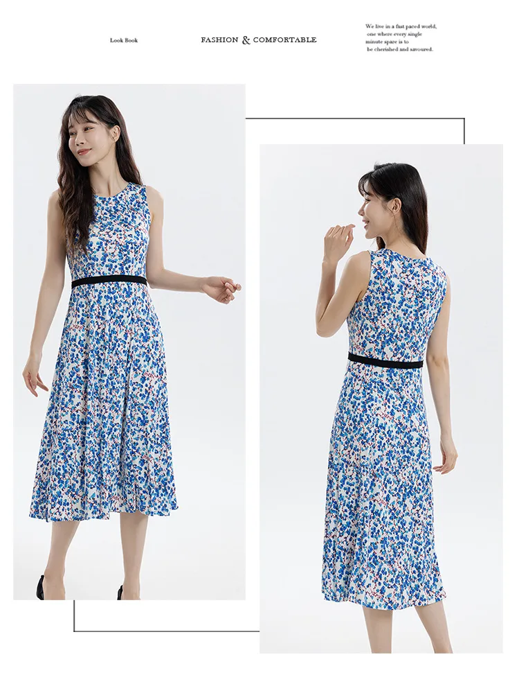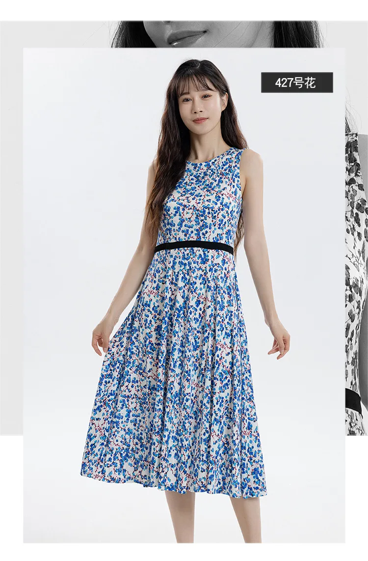 BirdTree, Natural Silk Elegant Knit Dresses, Women Sleeveless O Neck Floral, Commute Fashion Retro Dress, 2024 Summer