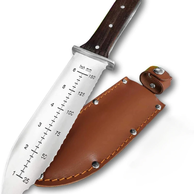 - The blade has a straight edge and a serrated edge, making it easy to saw through tough roots. Easily cuts into soil, with a depth scale marked on one side, so you know exactly how deep you're digging.
