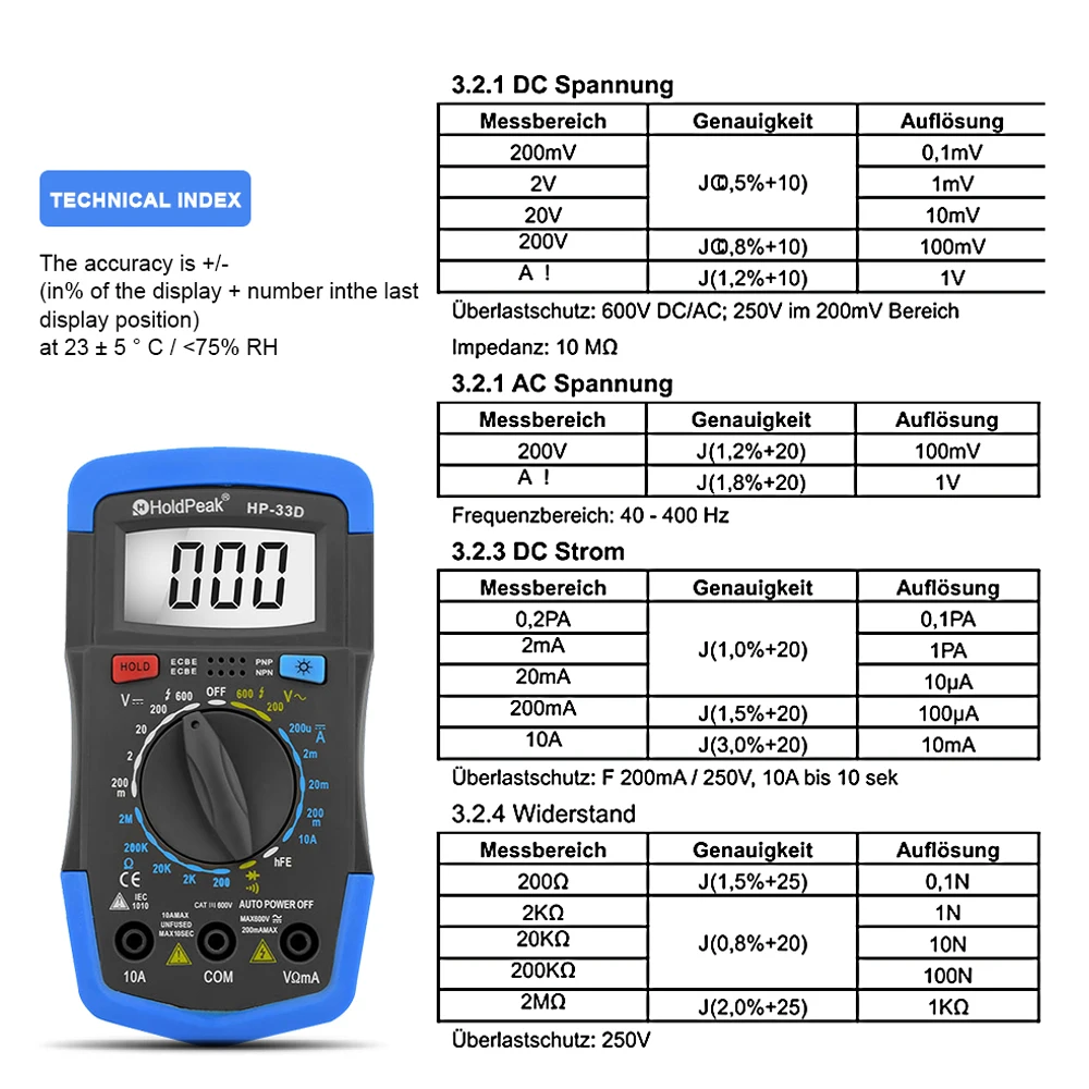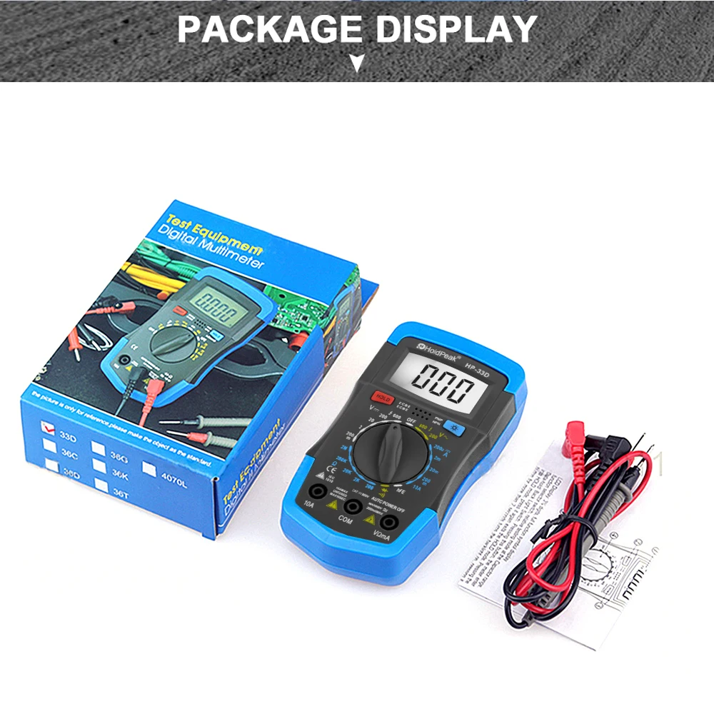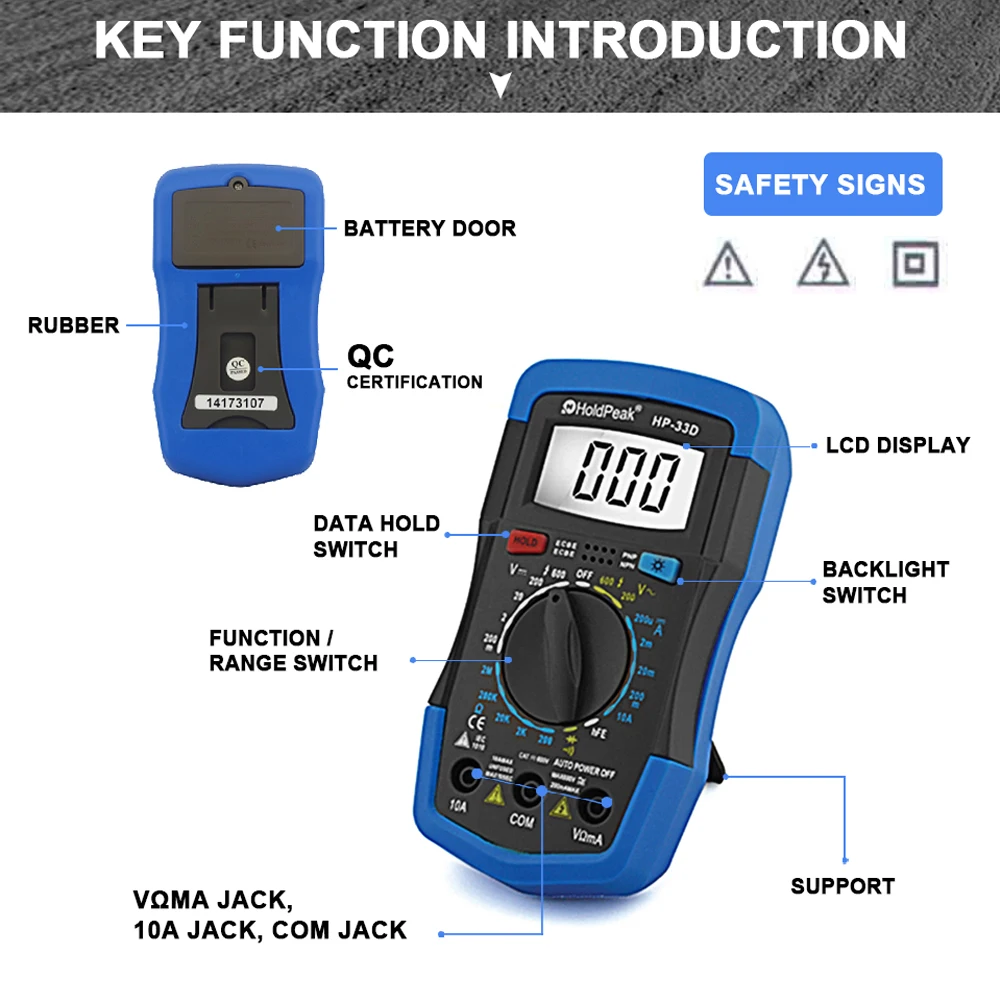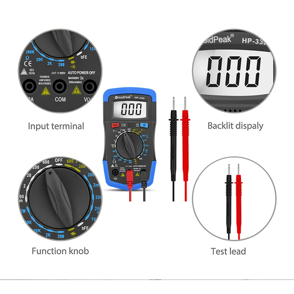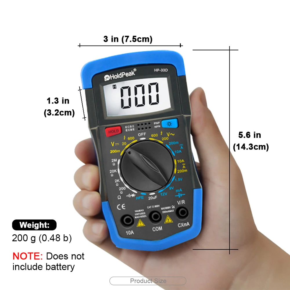 ❈Manual Range❈DC/AC Voltage Test❈DC Current Test❈Resistance Test❈Diode/ hFE Test❈Continuity Buzzer❈Back Light❈Auto Shut Down❈Data Hold