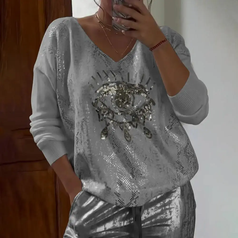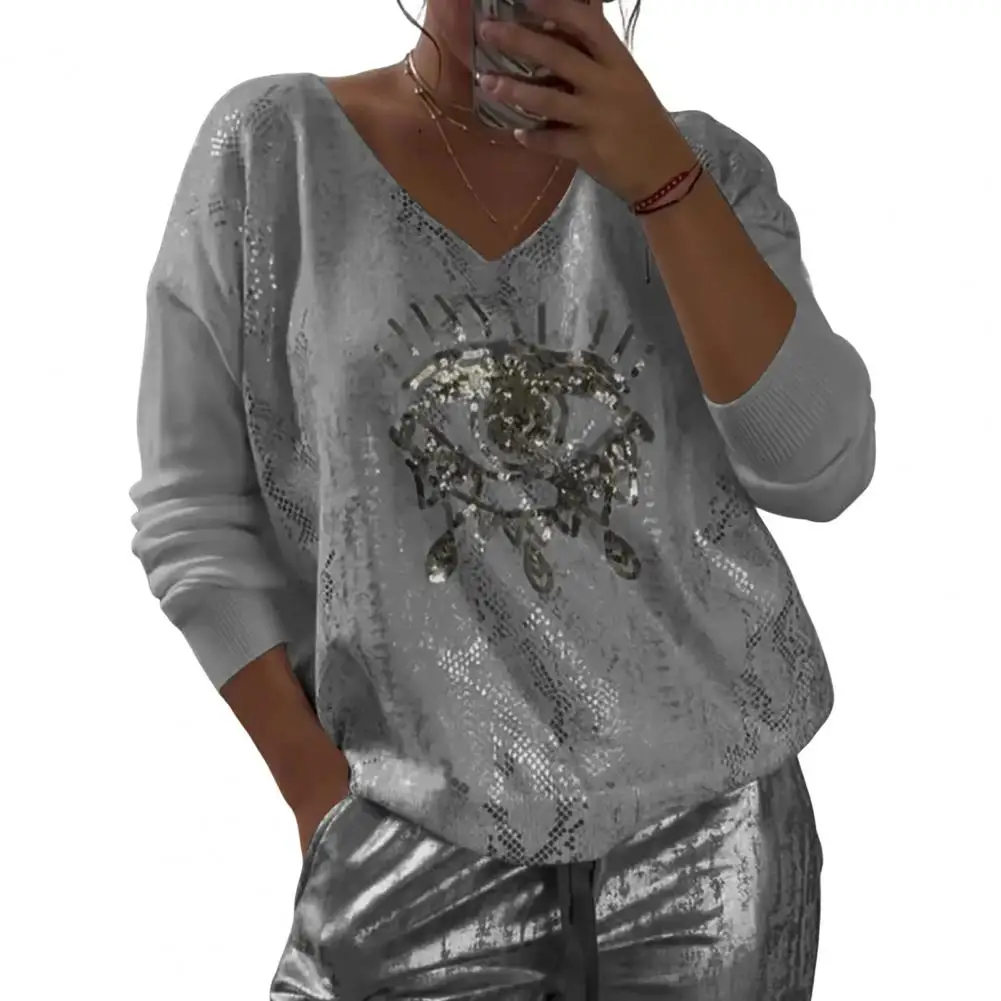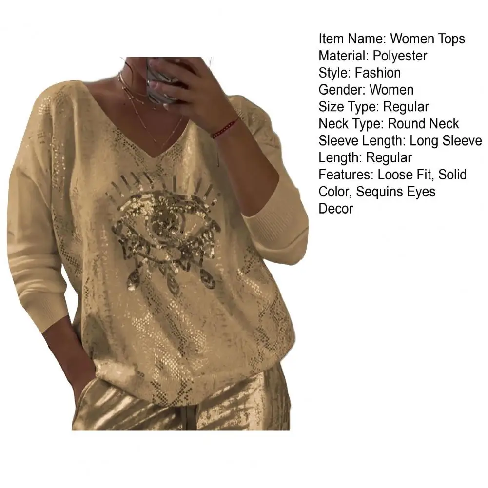 Stretchy Women Sweatshirt Stylish Women's Sequin Eye Decor Sweatshirt Long Sleeve Round Neck Pullover Top with Hot for Women