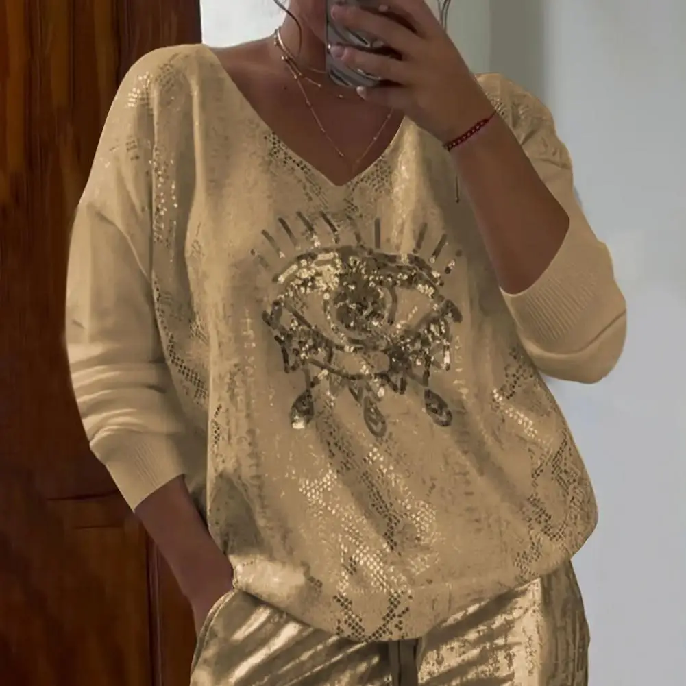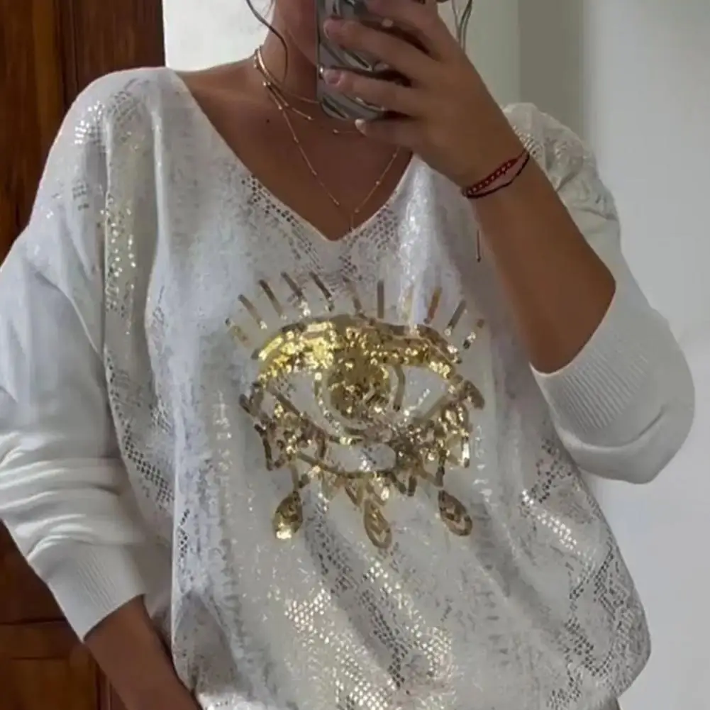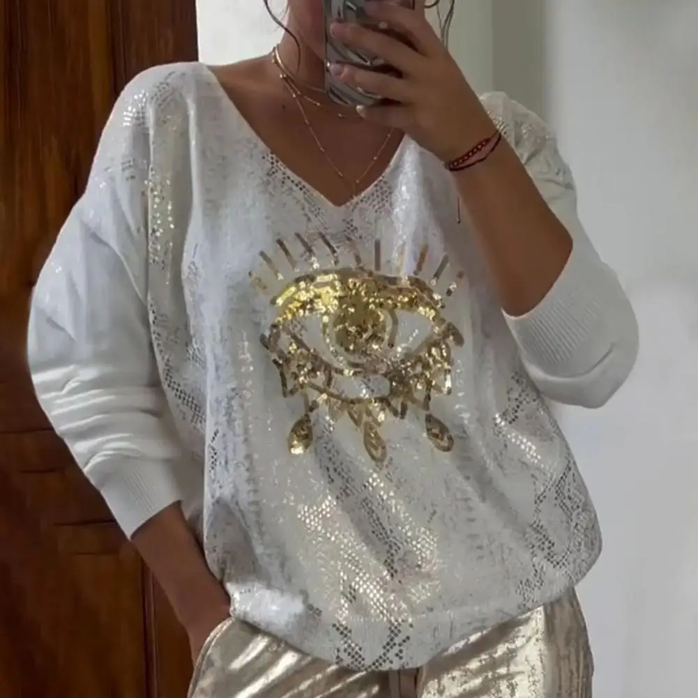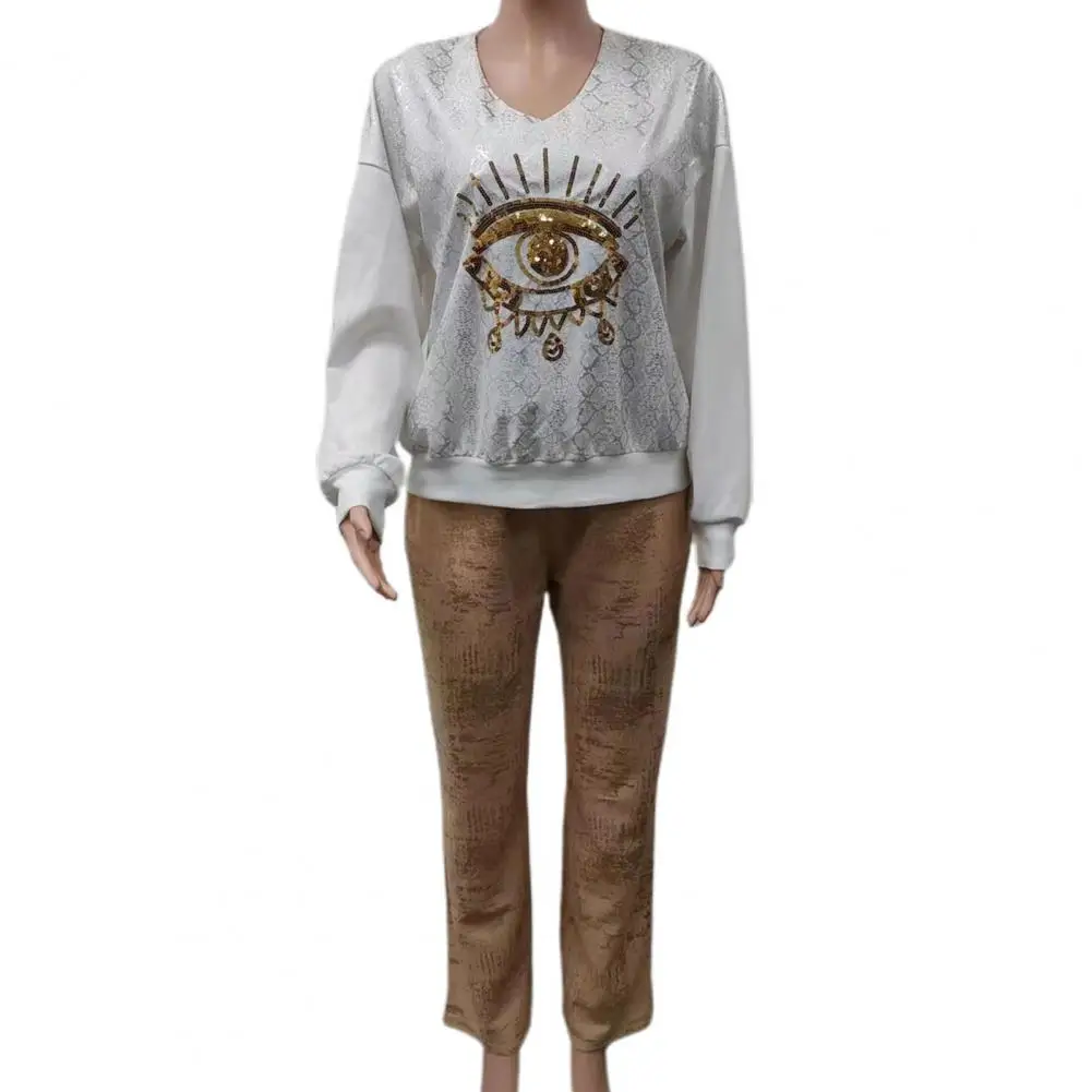 Stretchy Women Sweatshirt Stylish Women's Sequin Eye Decor Sweatshirt Long Sleeve Round Neck Pullover Top with Hot for Women
