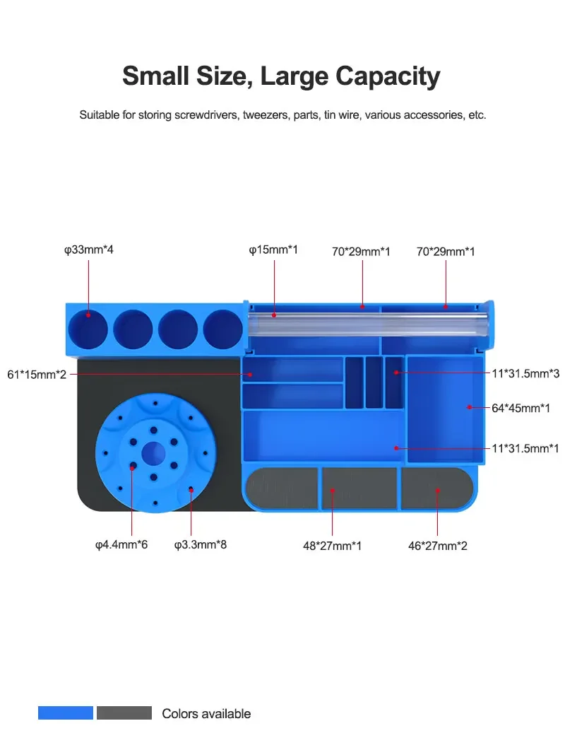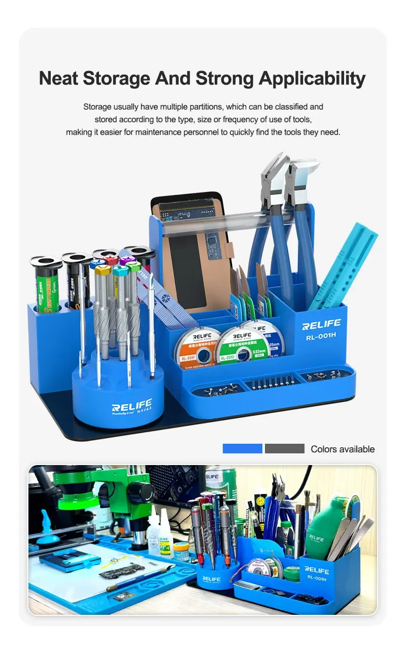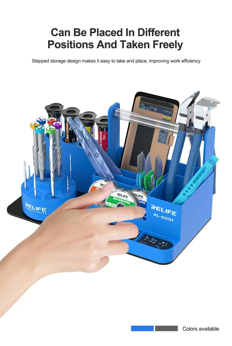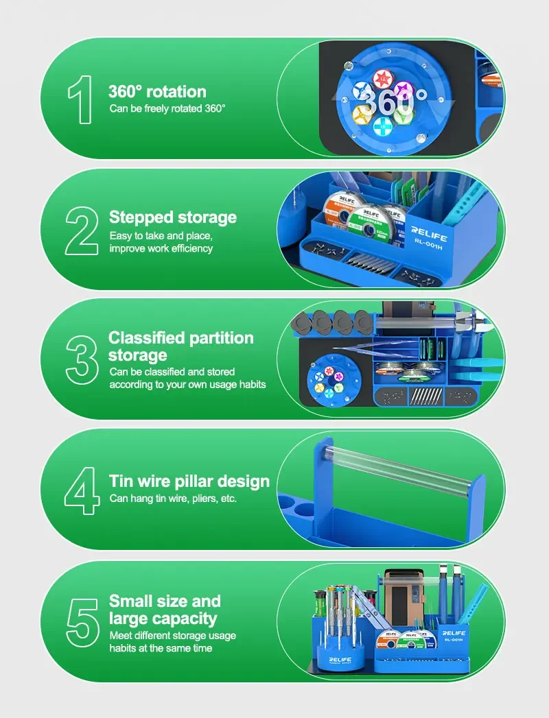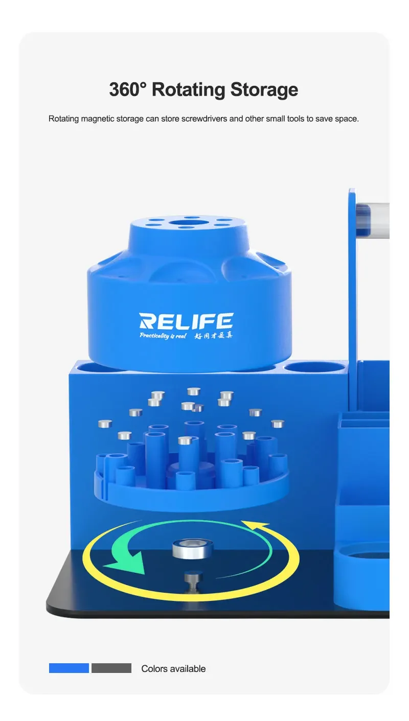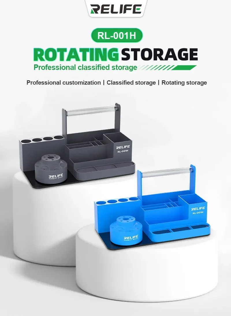 1. RELIFE RL-001H rotating storage holder, professional classified storage, can be freely rotated 360°, suitable for storing screwdrivers, tweezers, parts, tin wire, various accessories, etc.