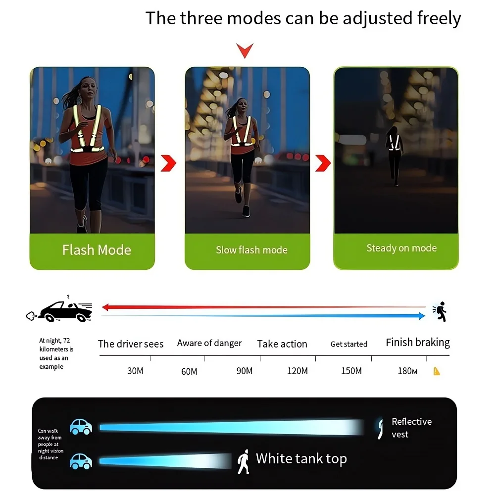 8 lights and 3 modes: This running vest comes with 4 LED light strips, red indicator lights on both sides, and 360 degree illumination.