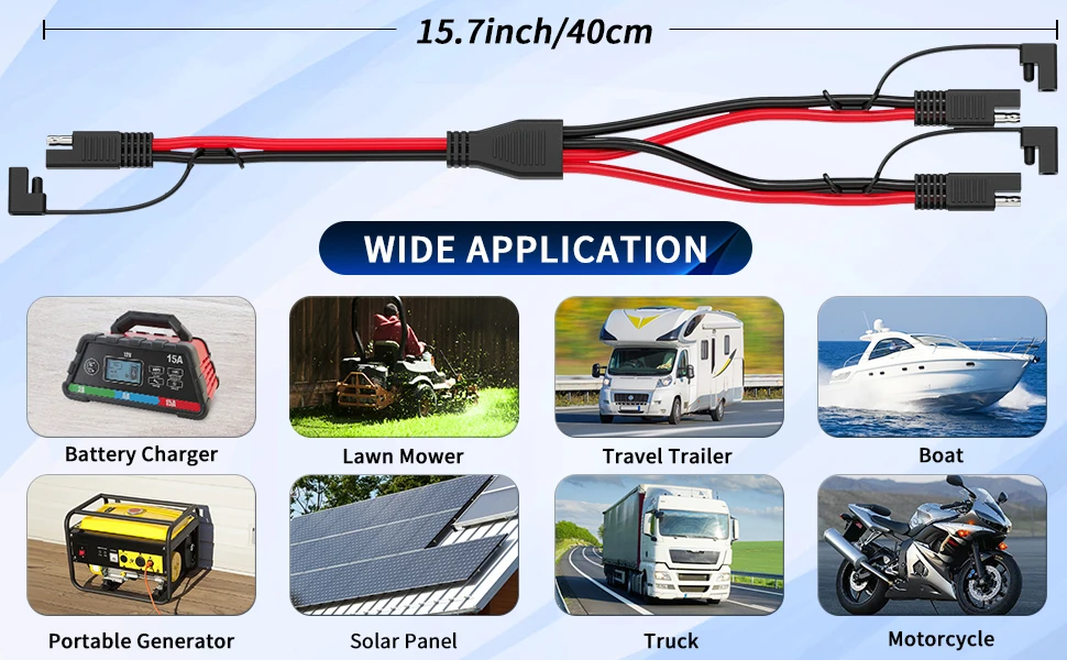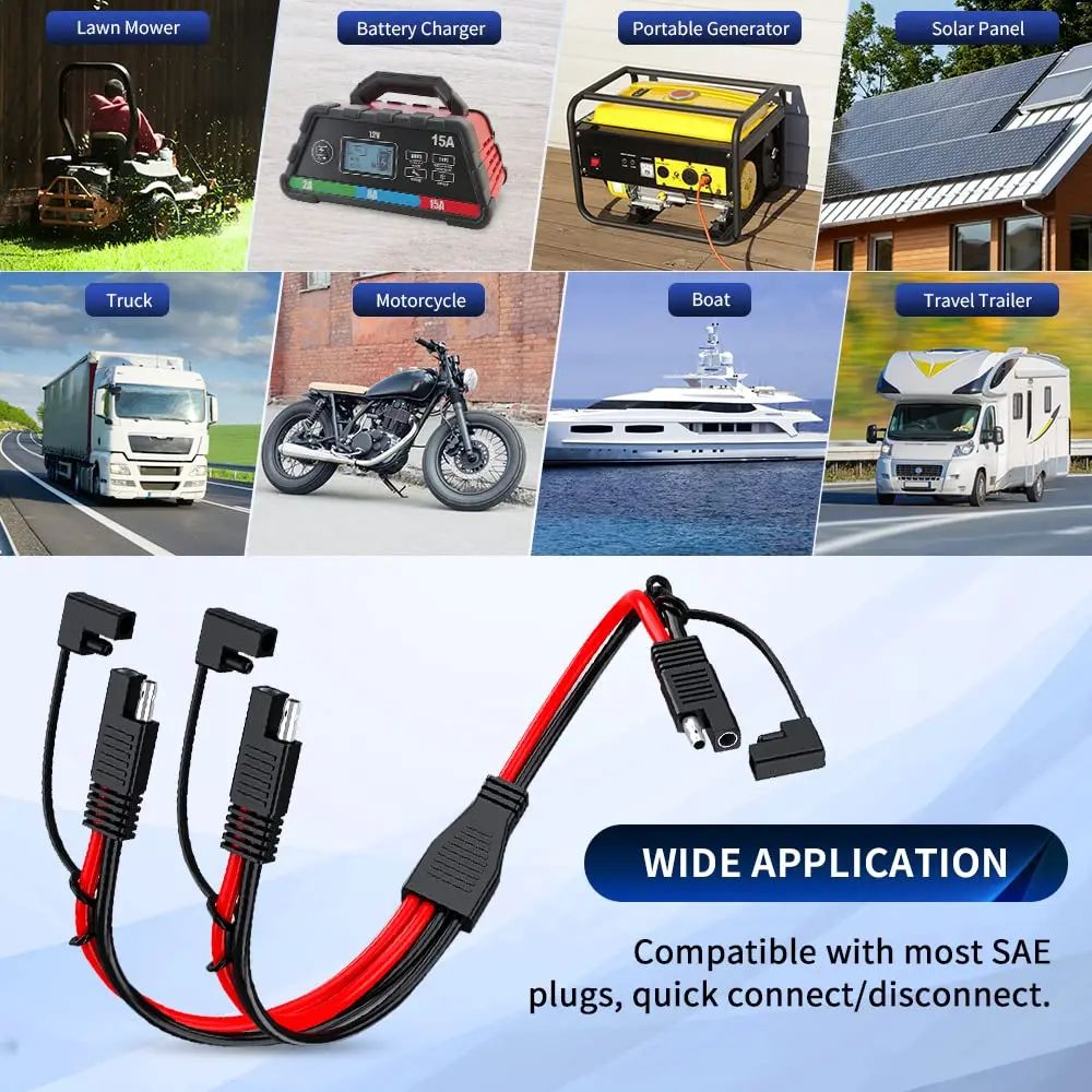 Bloopow sae battery connector y splitter cable is used to extend and maintain most batteries and chargers with sae 2 pin quick disconnect connectors. Widely used in a variety of batteries, solar panels, motorcycles, lawn mowers, ATV, RV, boat, trolling motors, tractors and other equipment that requires SAE plugs. Meet your needs for more sae adapters.