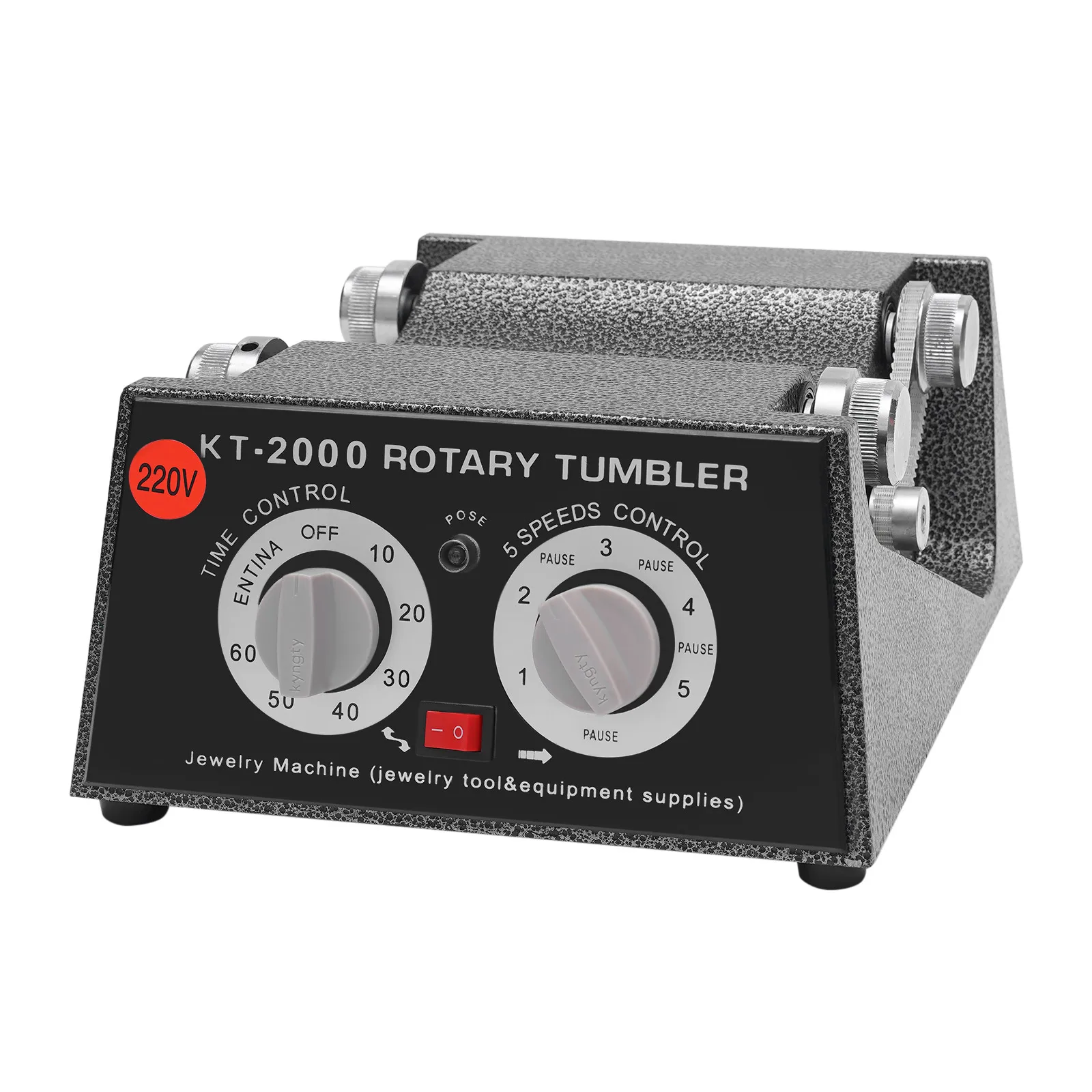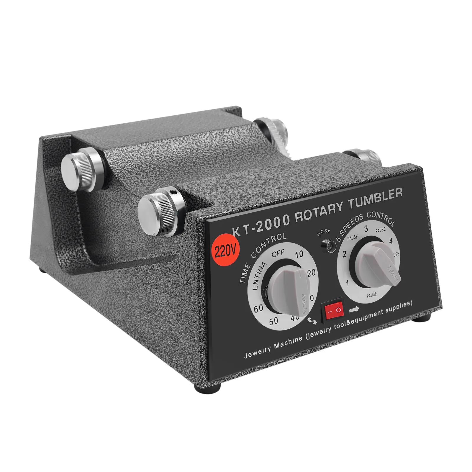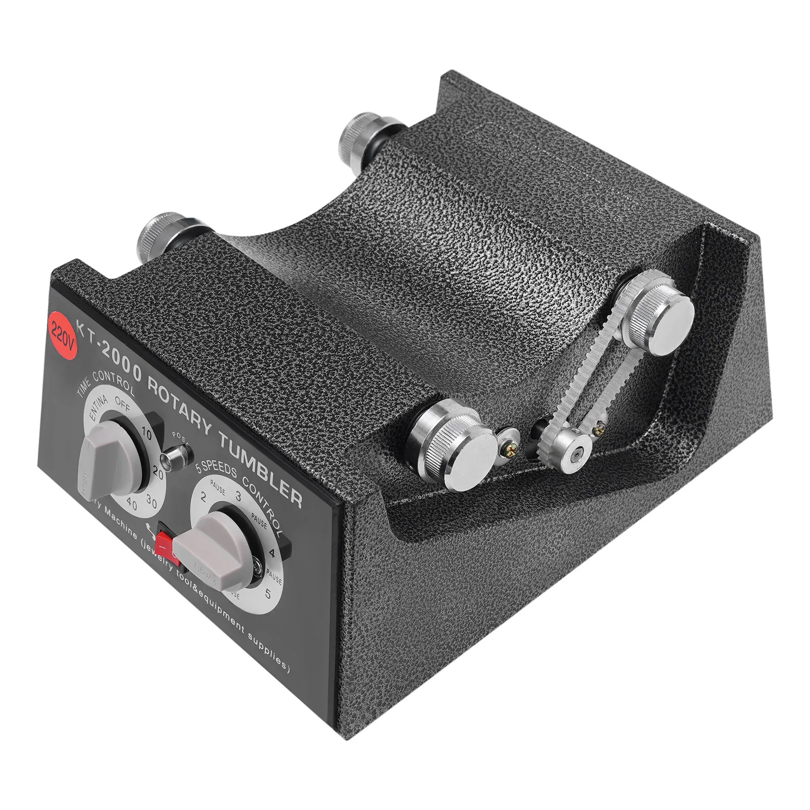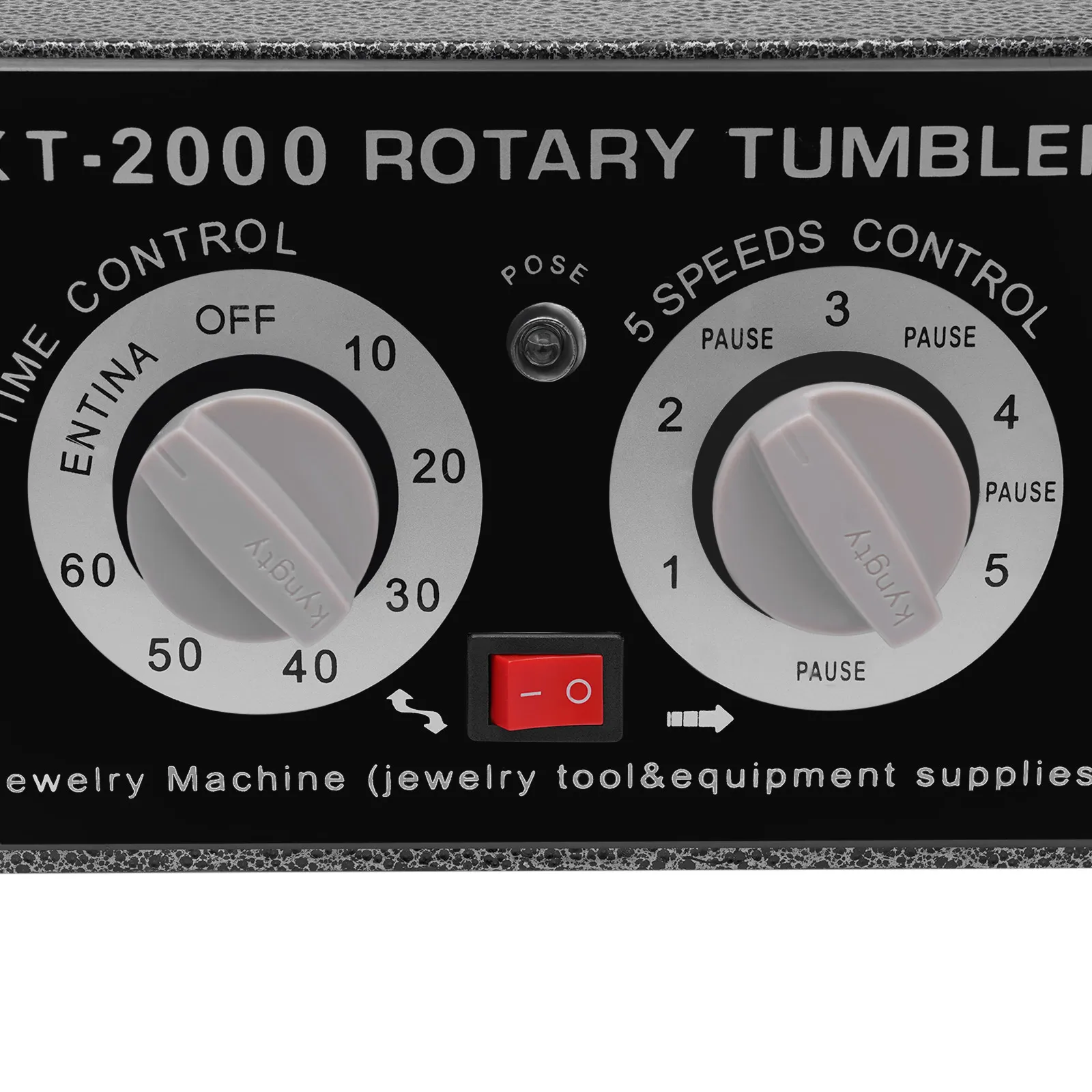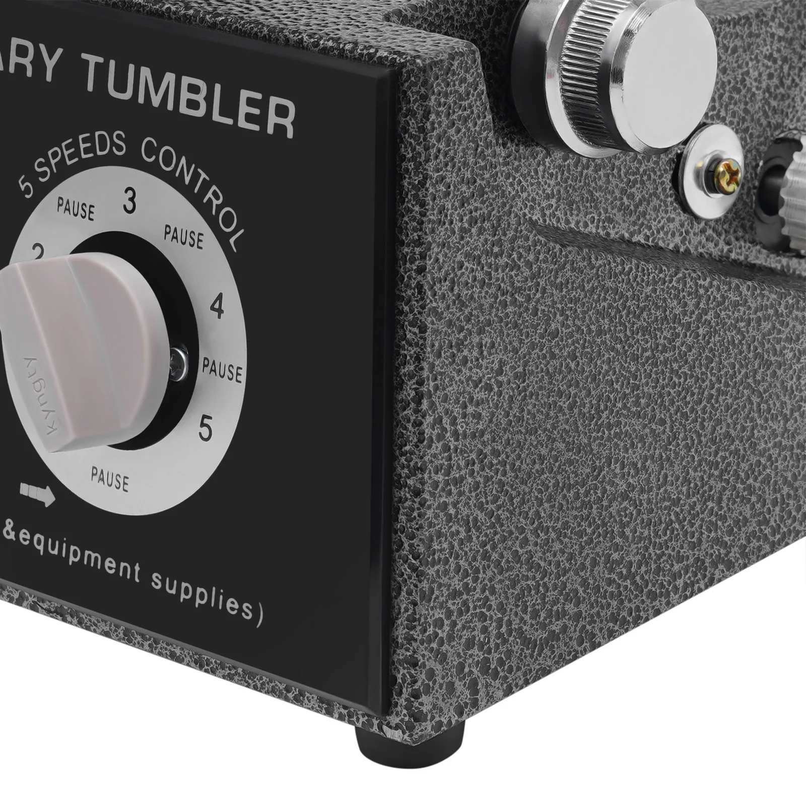 About switches of the Rotary Tumbler Jewelry Polisher, on the left is a timing switch. Turn the left is normally open, which is always opening; turn the right is the timing, set a few minutes and it will stop automatically. The right switch is the stalls, 1,2 ,3,4,5, each gear in the middle are separated by a stop