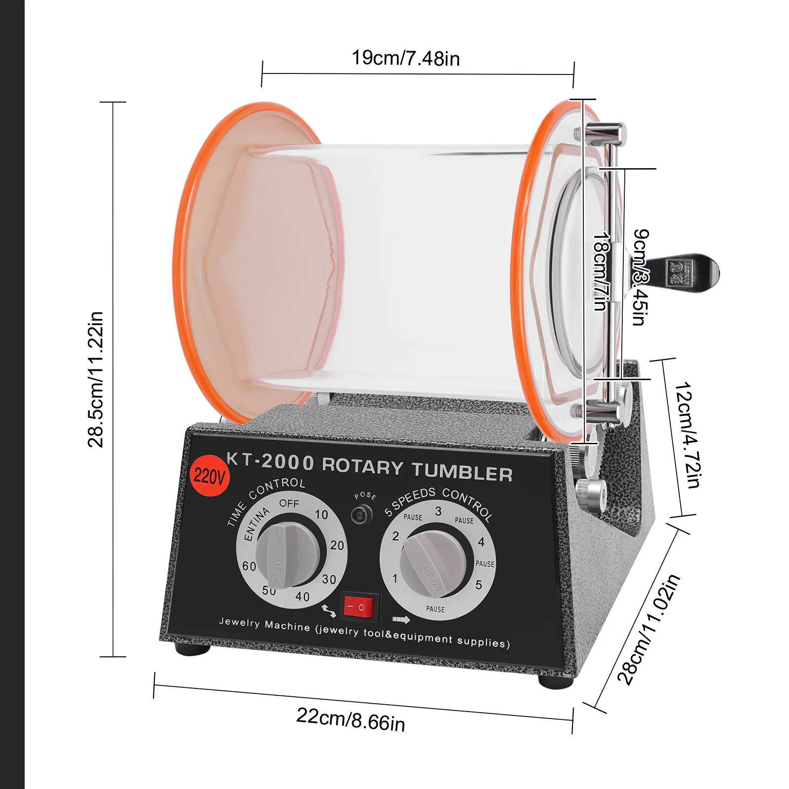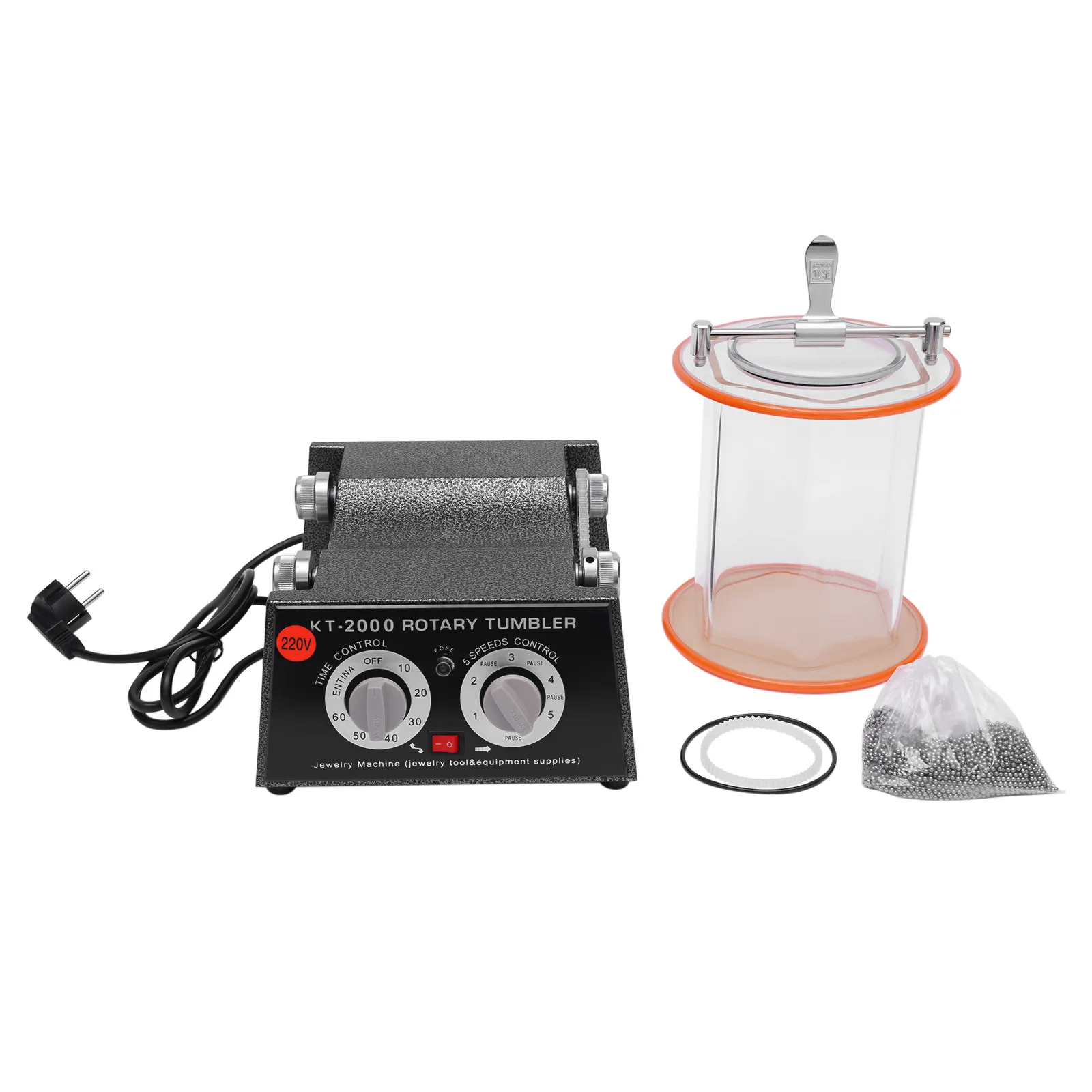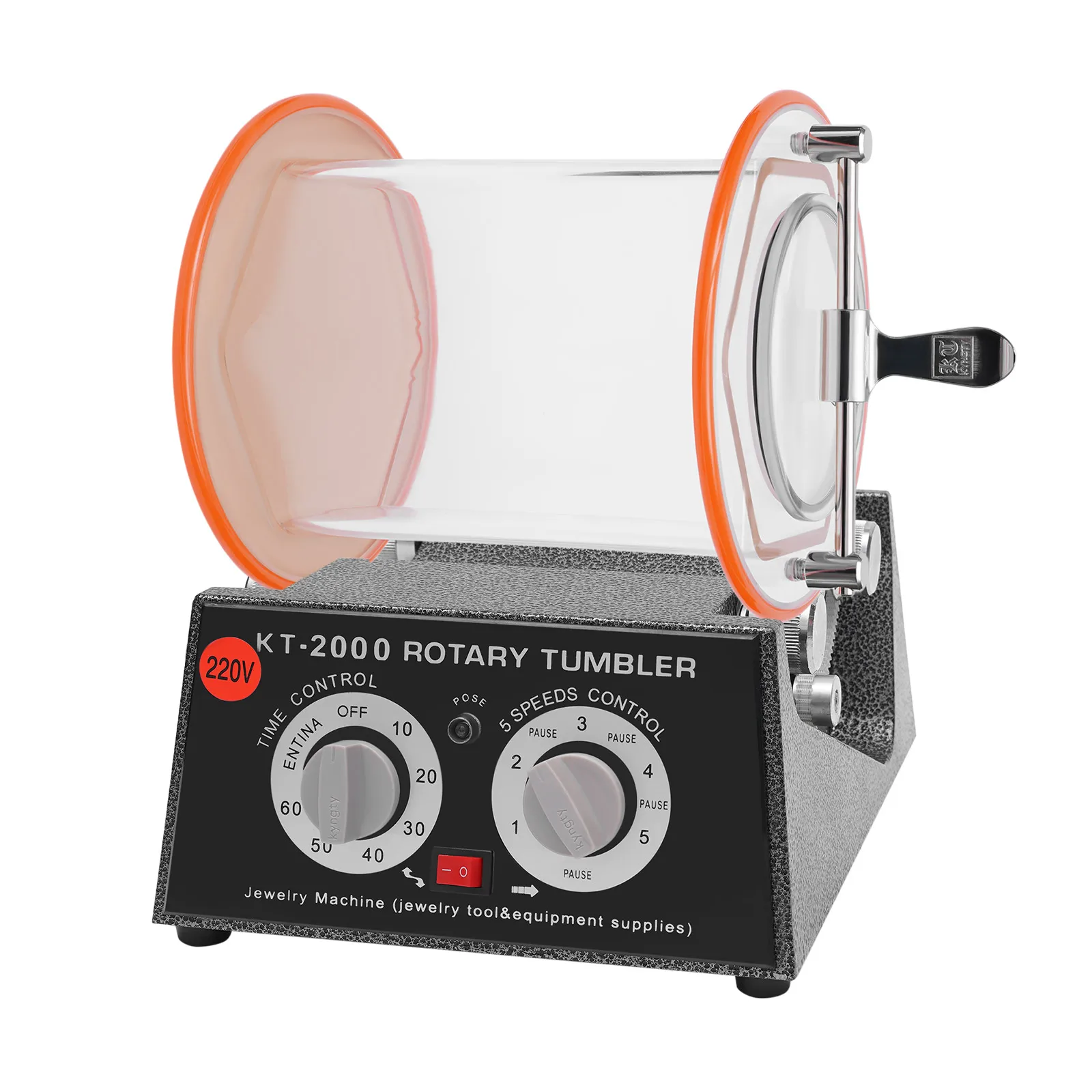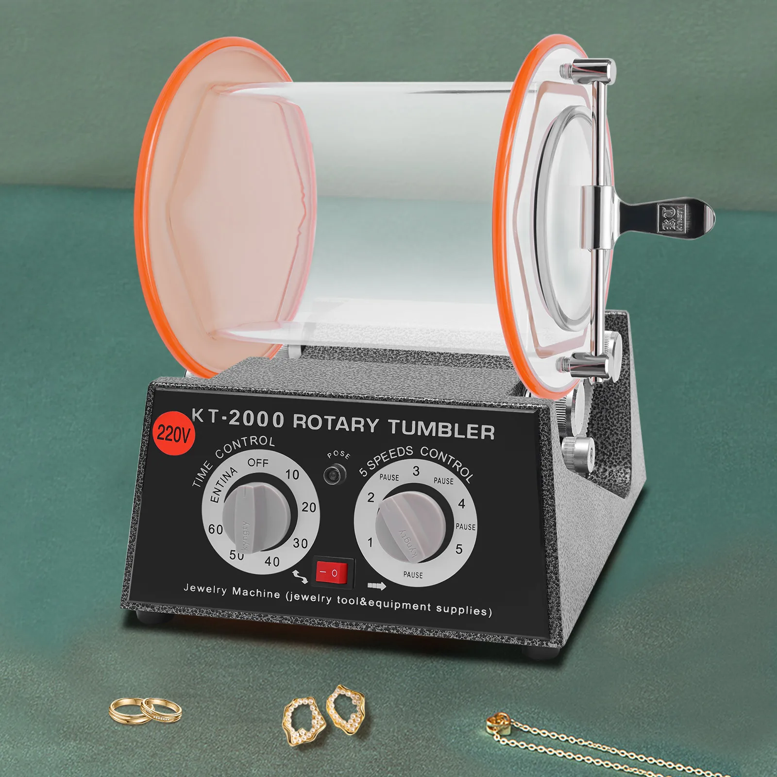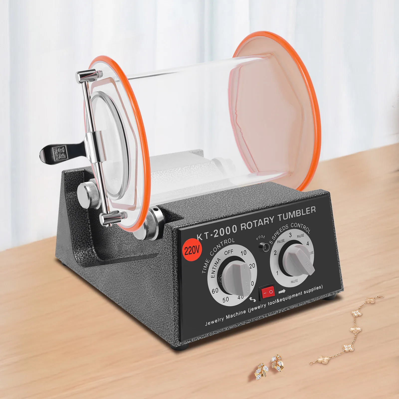 About switches of the Rotary Tumbler Jewelry Polisher, on the left is a timing switch. Turn the left is normally open, which is always opening; turn the right is the timing, set a few minutes and it will stop automatically. The right switch is the stalls, 1,2 ,3,4,5, each gear in the middle are separated by a stop