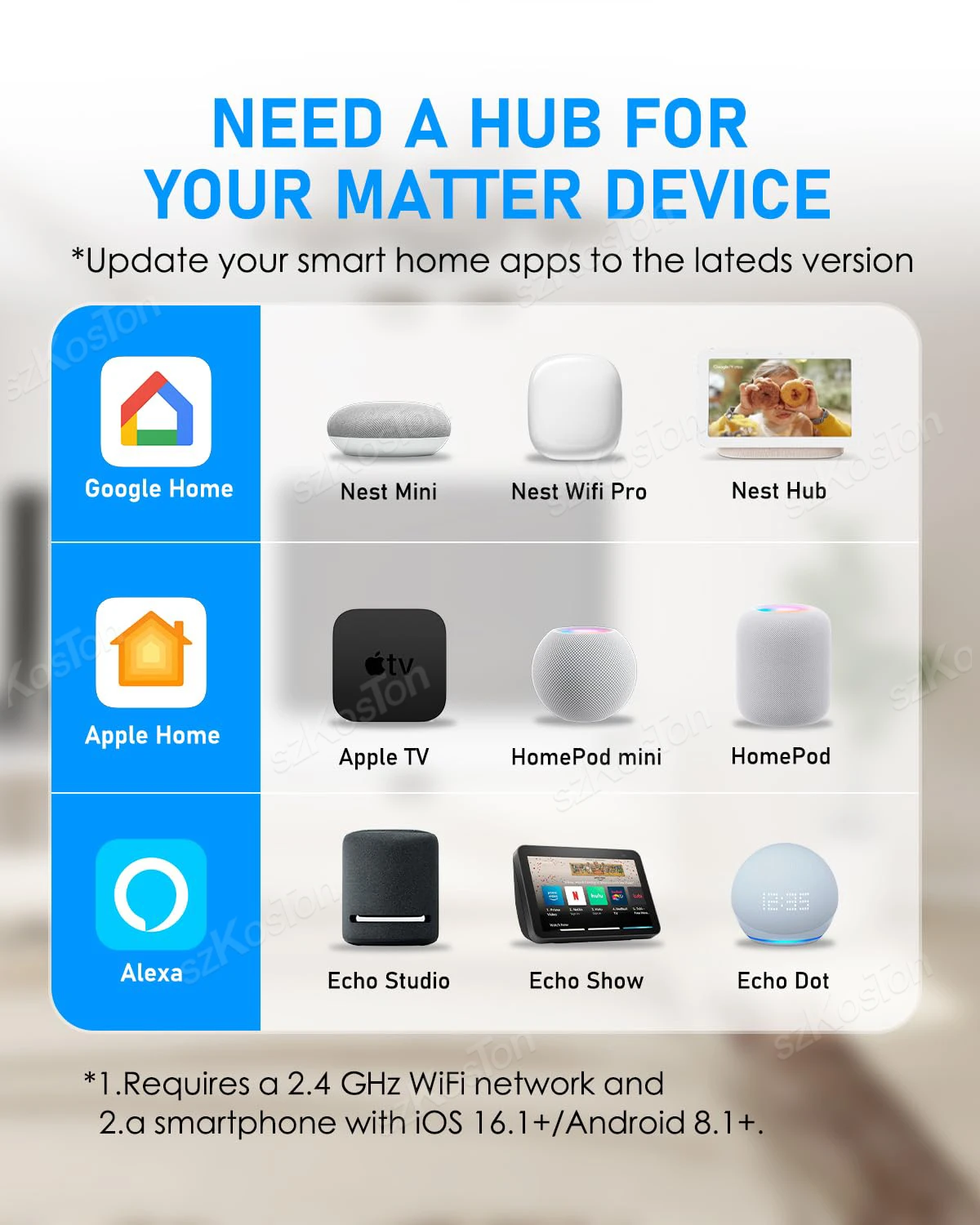 Requirements for Android users: The Uhome+ app on Android currently supports Matter. Android 8.1 or higher, 2.4 GHz as well as a hub for the selected platform, such as Samsung SmartThings Hub v3, Amazon Echo (4th generation), Google Nest Hub (2nd Generation), Nest Hub Max or Nest Wifi Pro.