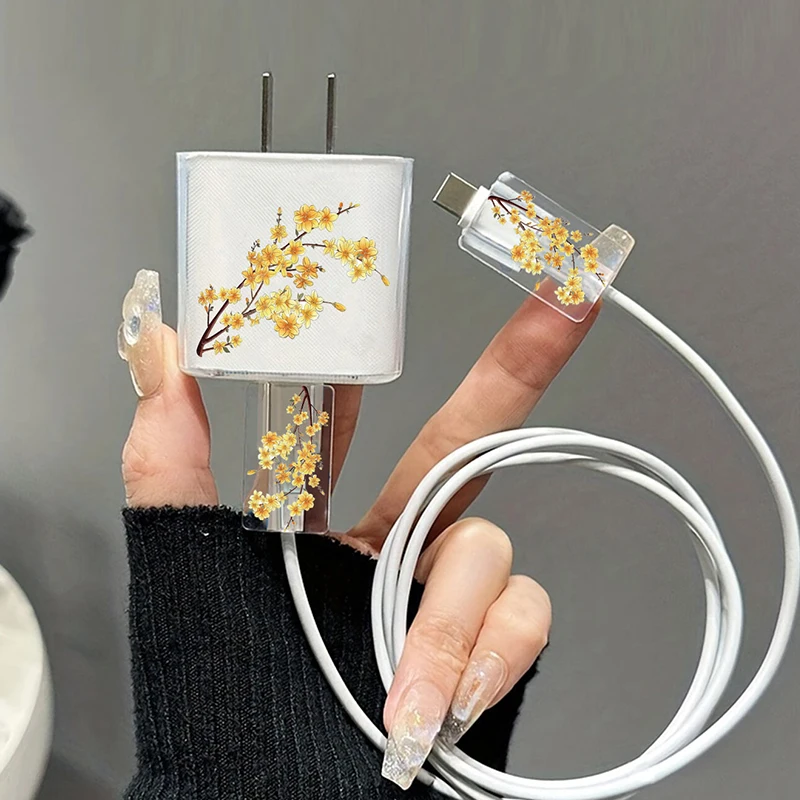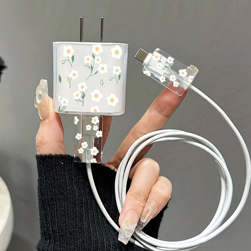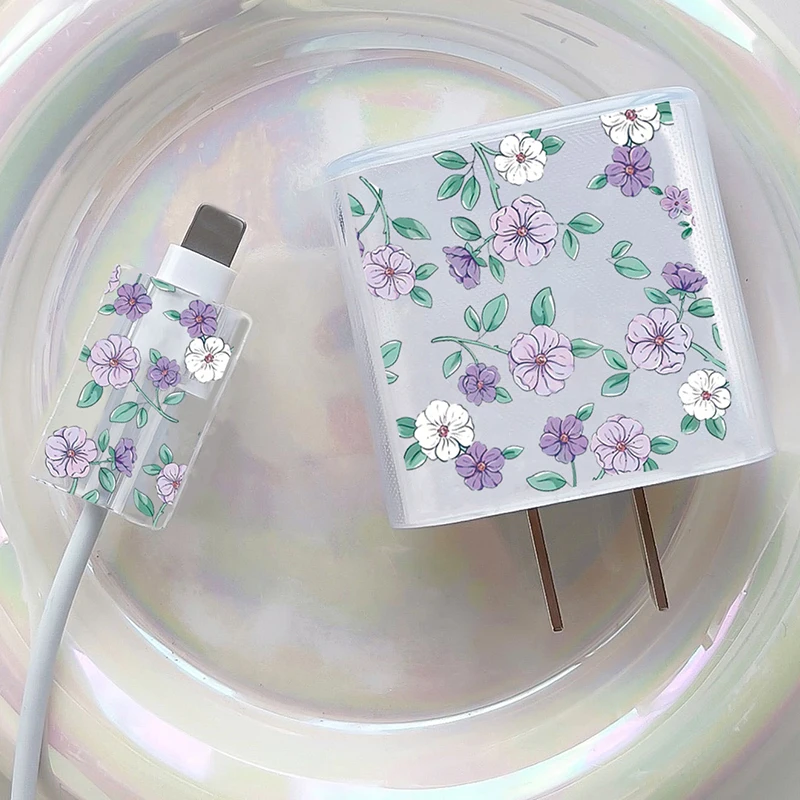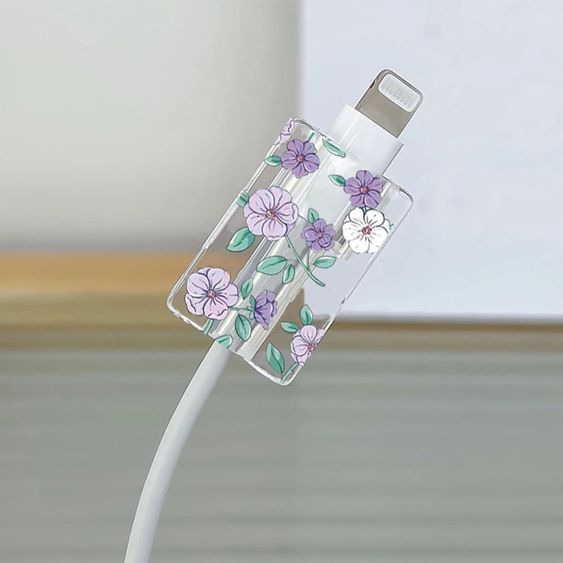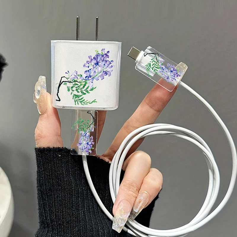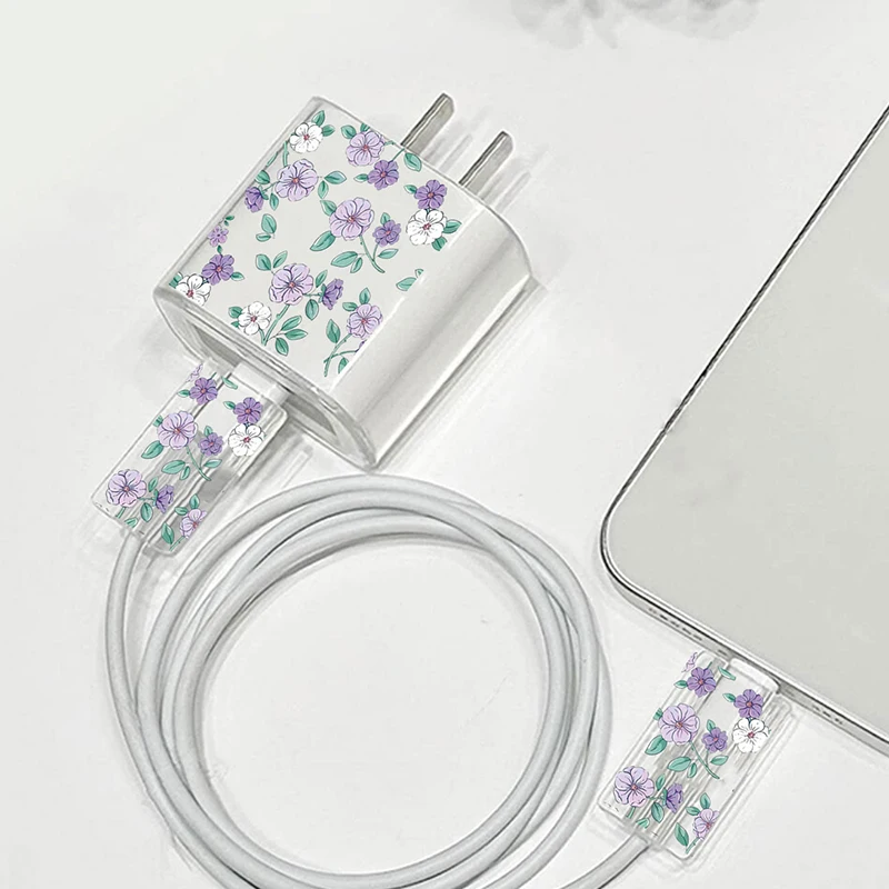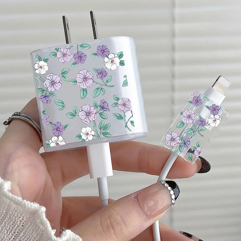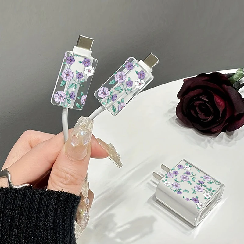 Transparent Purple Flowers Case For Apple 18/20w Charger Protective is Applicable To iPhone 15/14 Data Head Bite Protector Shell