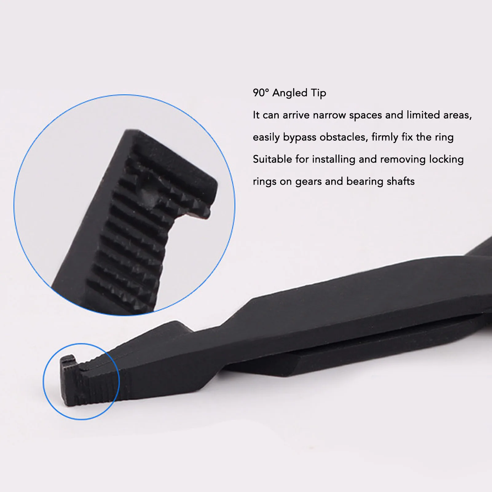 1. 90° ANGLED TIP: The 90° angled tips of the snap ring pliers allow for easy access to narrow spaces and limited clearance areas, effortlessly maneuvering around obstacles and securely gripping rings.