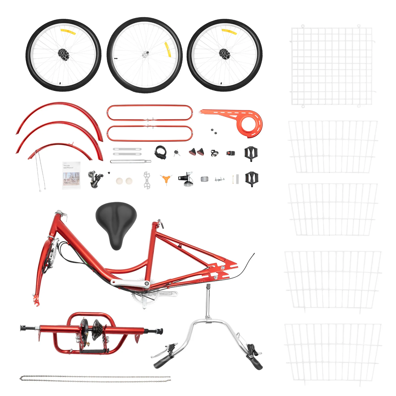 Mudguards: The front and rear wheels are equipped with mudguards, effectively blocking water or mud splashing and keeping the tricycle clean.
