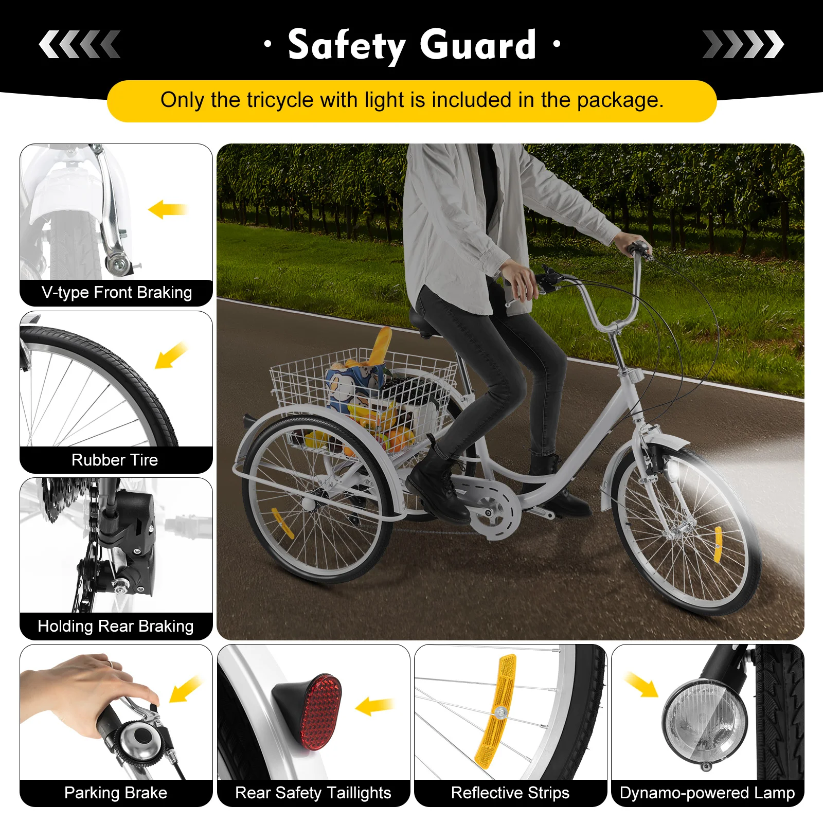 High Safety: The mudguard bracket of this adult tricycle uses an O-shaped crash beam to make its body structure more solid, allowing you to ride safely. Its braking system uses an aluminum left hand with a lock dead function. And it also comes with lights and reflectors, enabling it to provide you with greater security even at night.