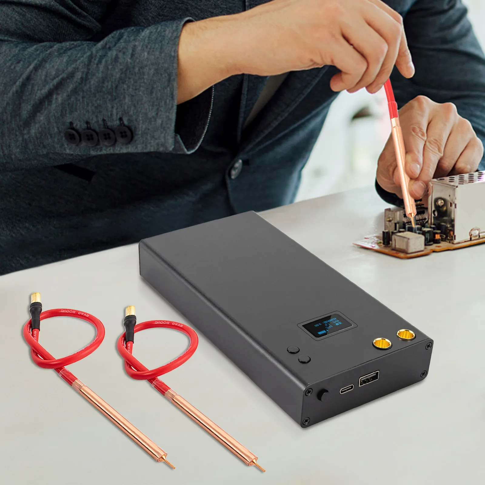 Built-in 11000mAh Rechargeable Battery——With built-in 11000mAh high-rate rechargeable polymer lithium batteries and type-C&USB ports, it can continuously weld thousands of points after being fully charged(about 3 hours) and can be used as a power bank to charge your phone for 3-5 times.