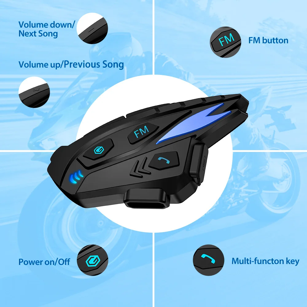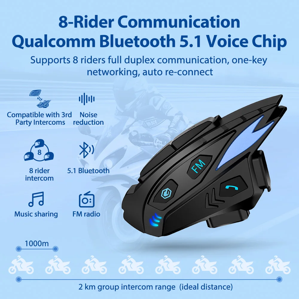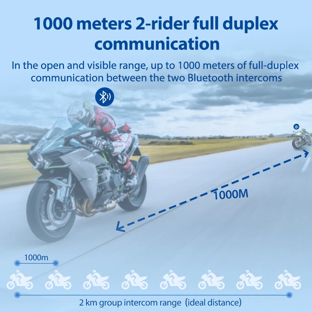 Communication distance: 1000 meters (2 riders), 2000 meters (group intercom mode), under ideal environment