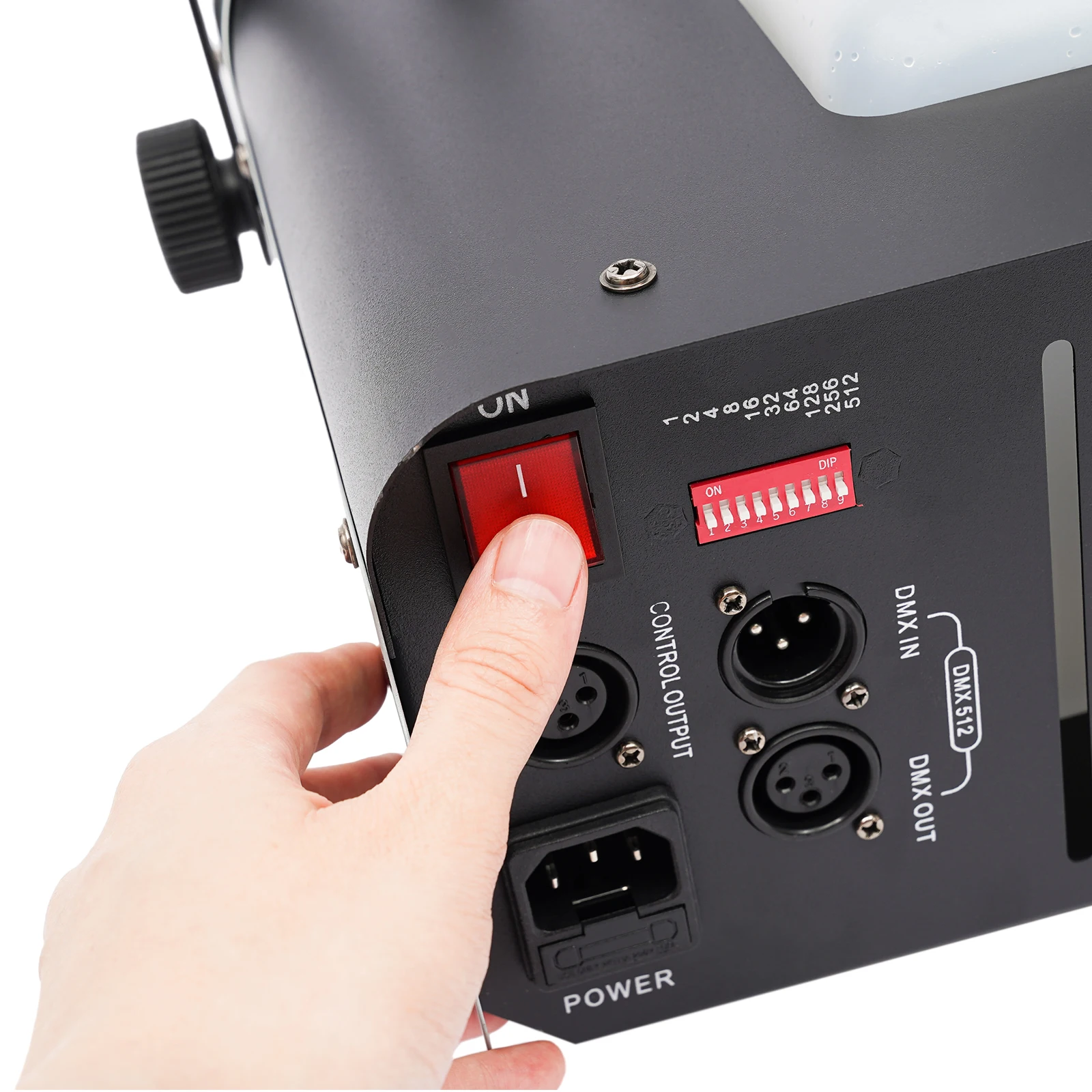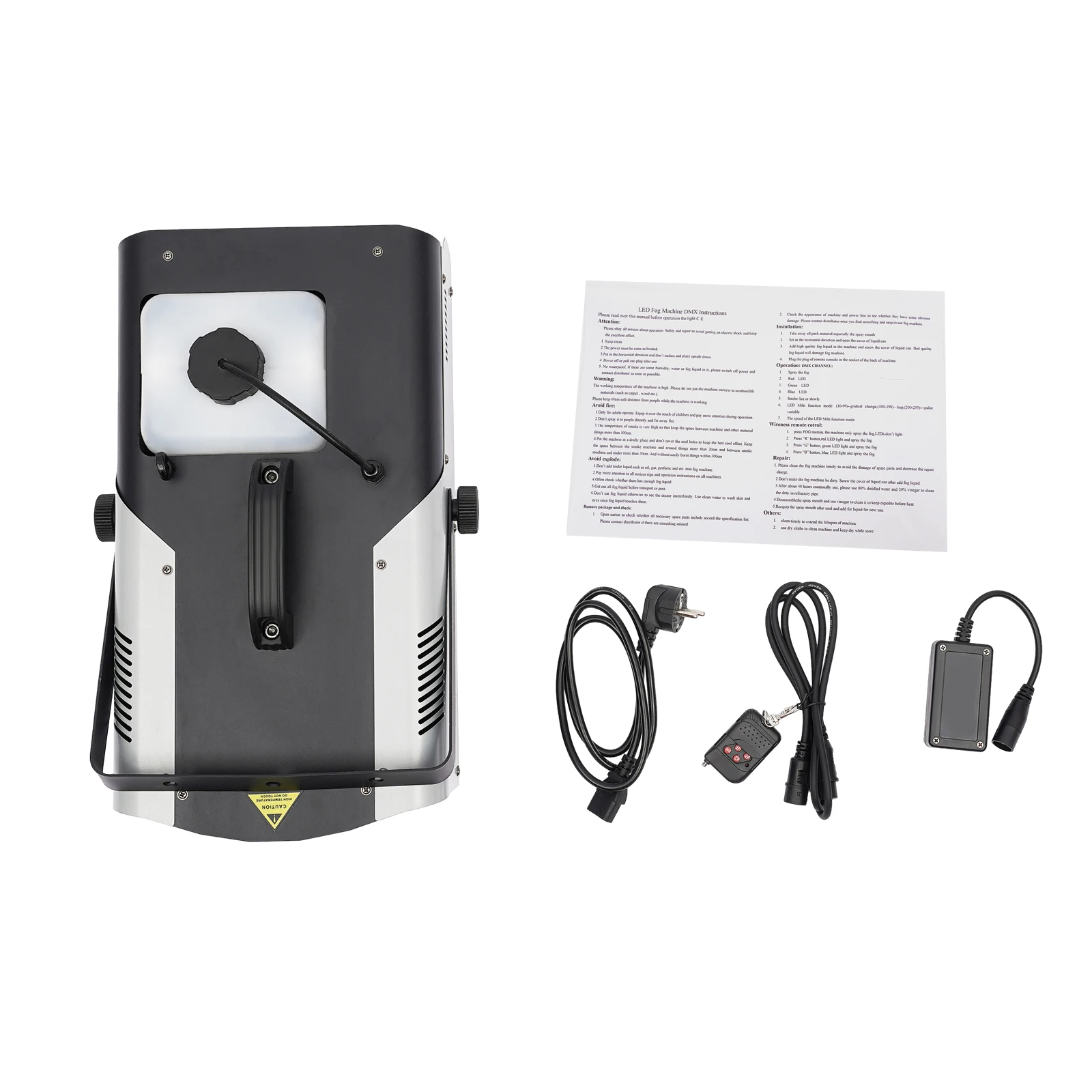 It has 9x3 watt 3in1 RGB multichip LEDs that illuminate the fog in all imaginable colors. The Flash LED fog machine is equipped with a high-quality thermostat and an equally high-quality, electronically controlled metal pump, which guarantees durability and long-term reliability.