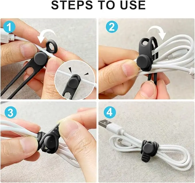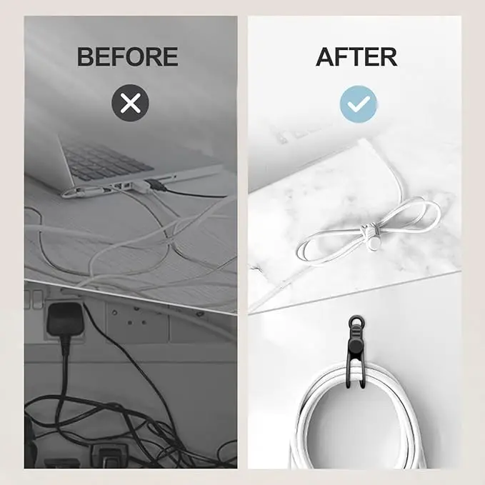 Flexible Design & Reusable: The cord management-organizer is designed with a button, which can be opened and connected quickly without worrying about falling off. It can be reused, no waste!