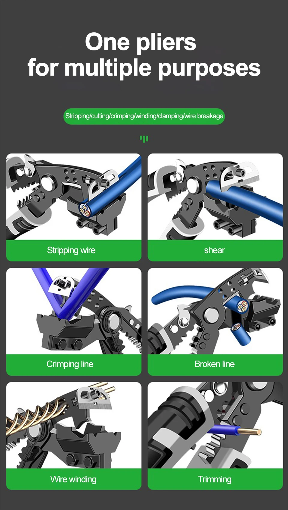 Usage: stripping, crimping, breaking, winding, bending, and cutting wires.