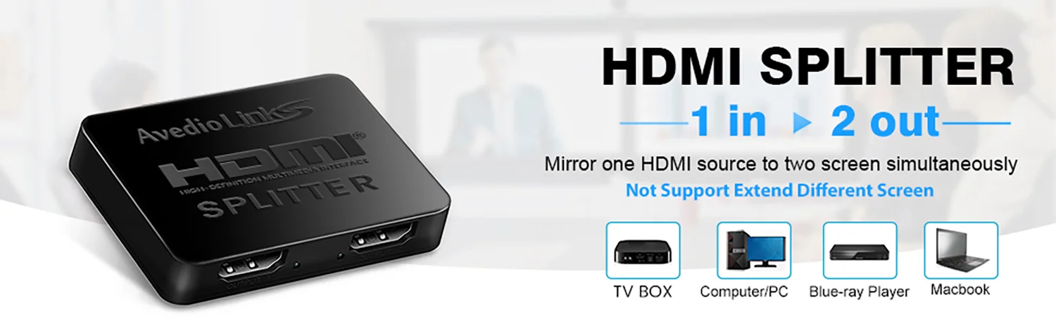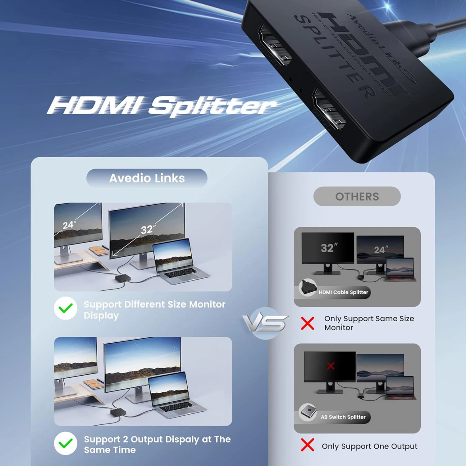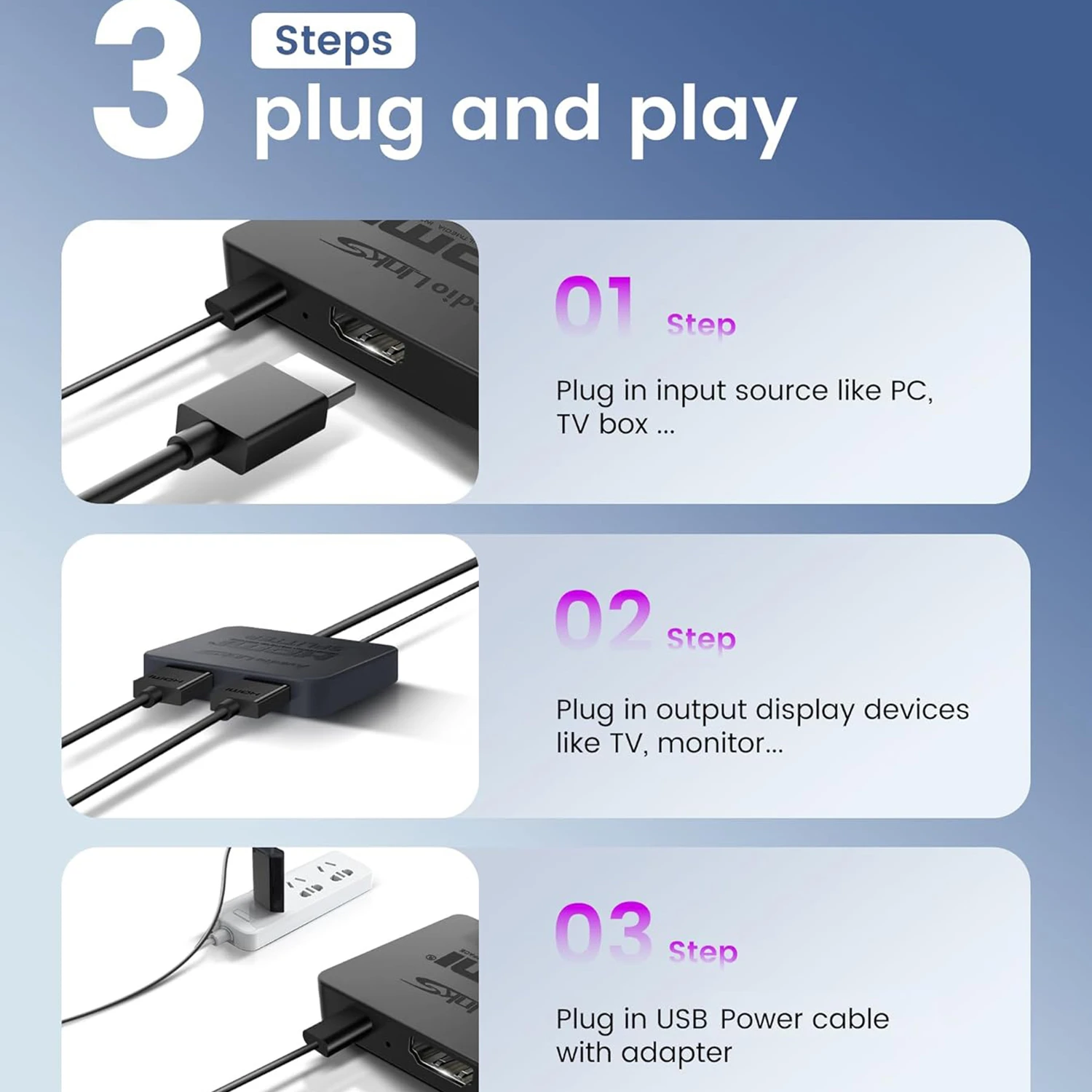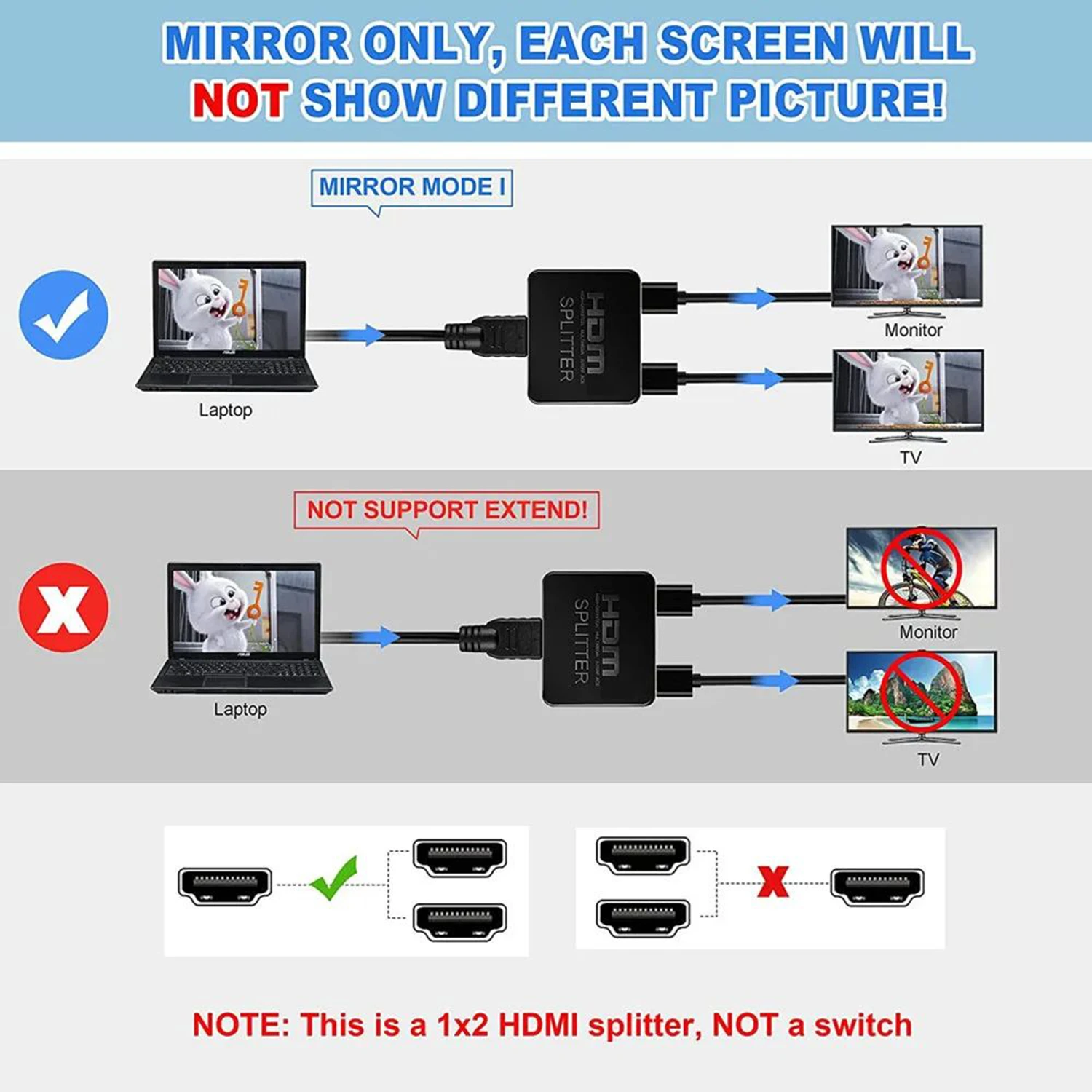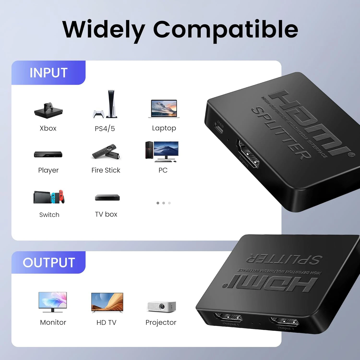 • Dual Display Capability: Effortlessly splits one HDMI input signal to two HDMI displays, enabling you to enjoy content on multiple screens simultaneously.