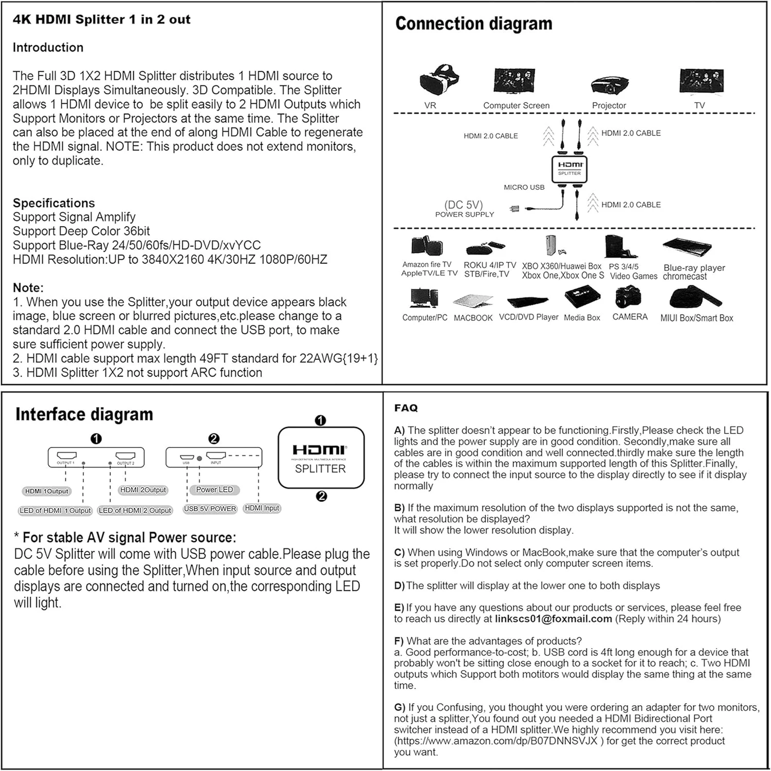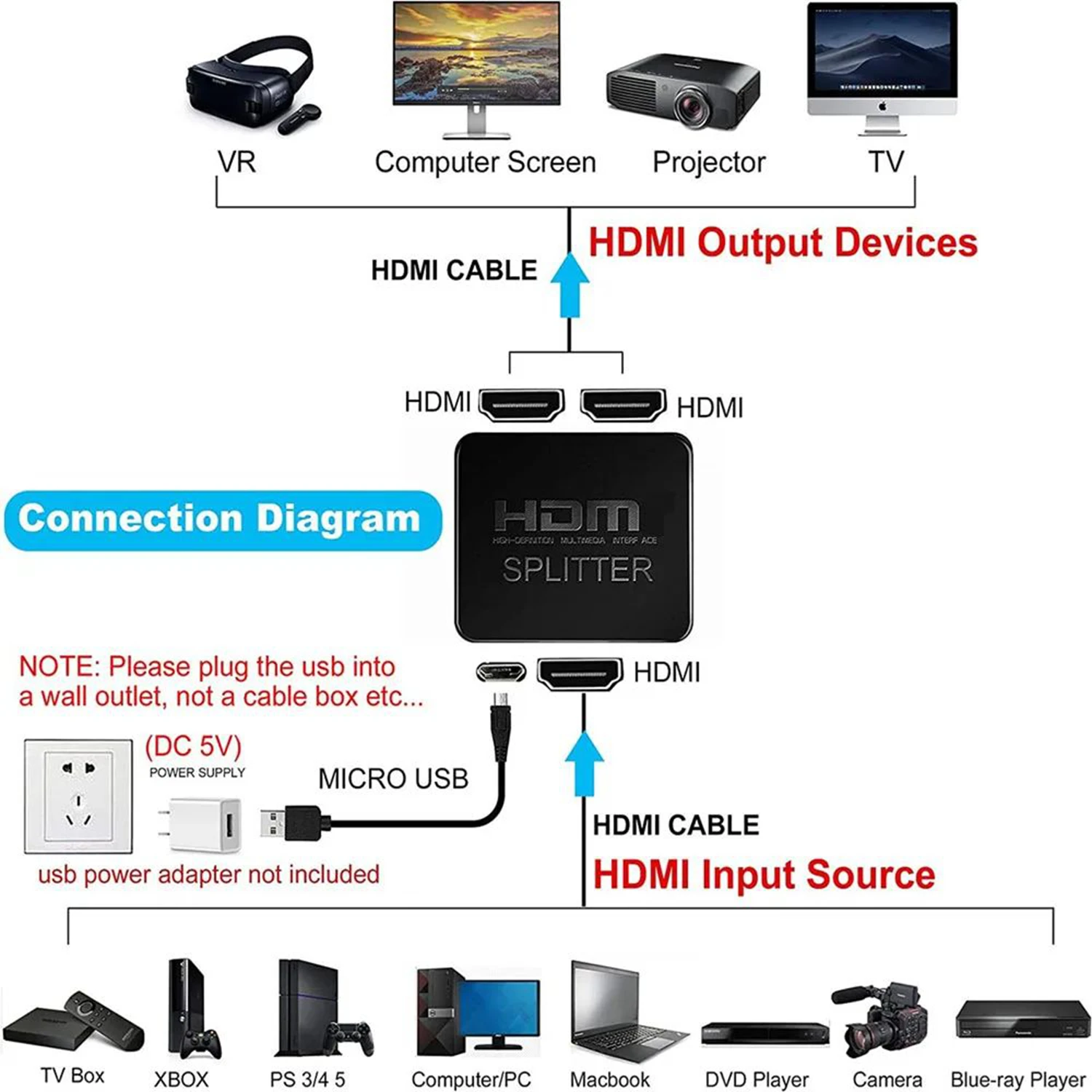 Please Note: HDMI cable and USB power adapter are not included in the package, you need to bring your own. You will only receive the device, power cable and instruction manual. Upgrade your home entertainment system with our HDMI Splitter today and enjoy a more immersive and diverse viewing experience!