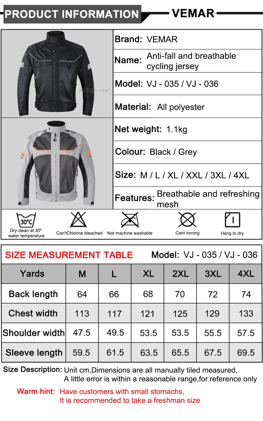 2XL: Back Length 70cm, Bust 125cm, Shoulder width 53.5cm, sleeve length 65.5cm
