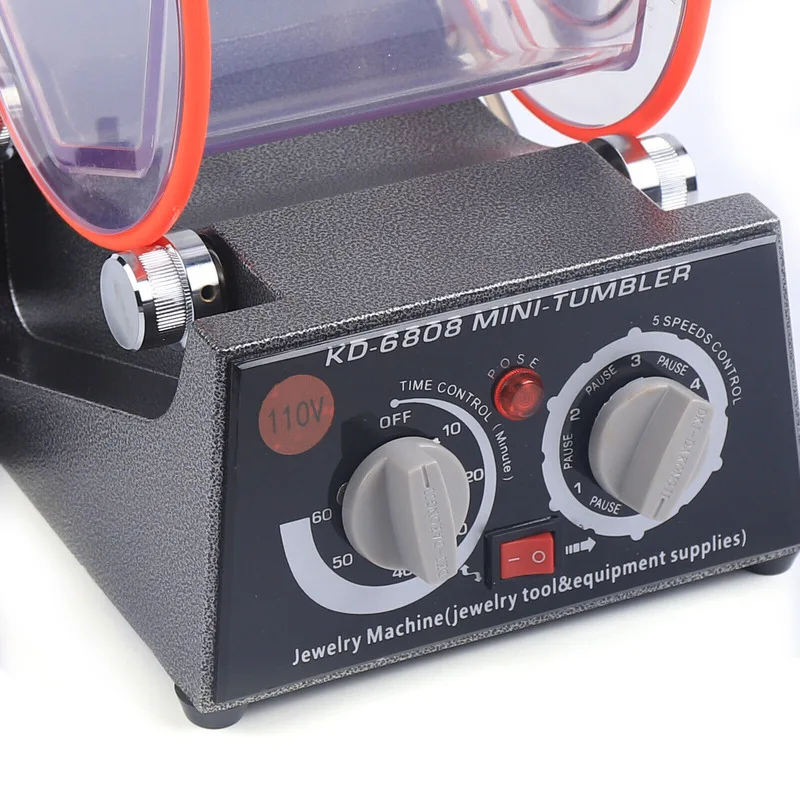 • About switches of the Rotary Tumbler Jewelry Polisher, on the left is a timing switch. Turn the left is normally open, which is always opening; turn the right is the timing, set a few minutes and it will stop automatically. The right switch is the stalls, 1,2 ,3,4,5, each gear in the middle are separated by a stop.